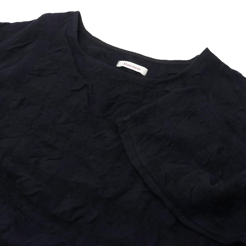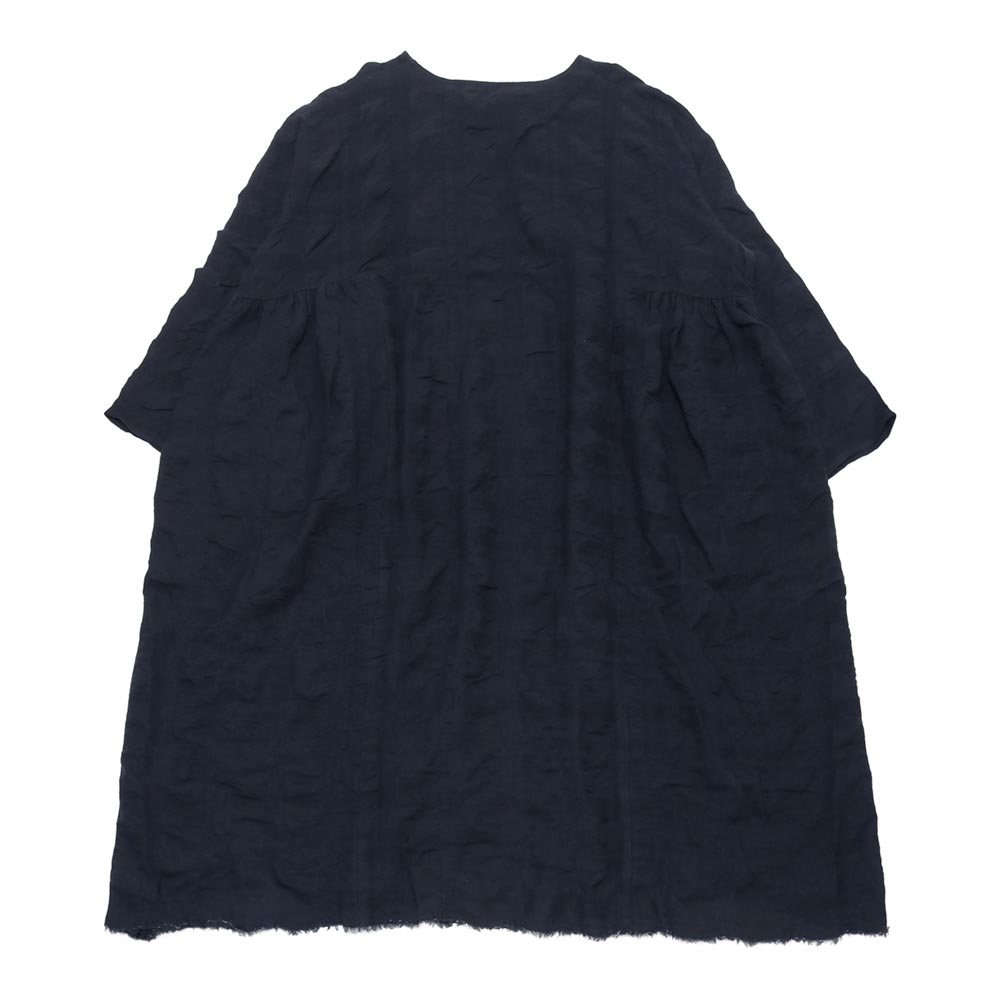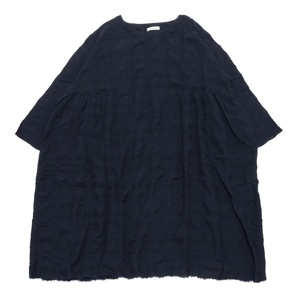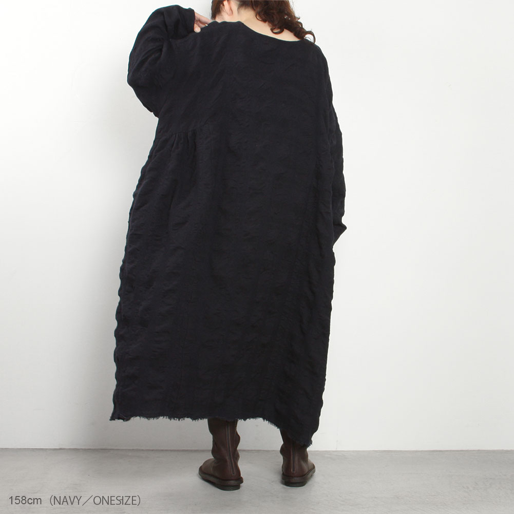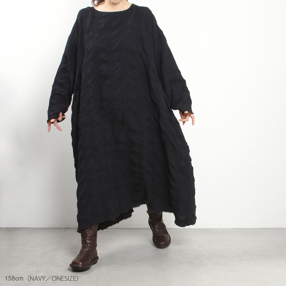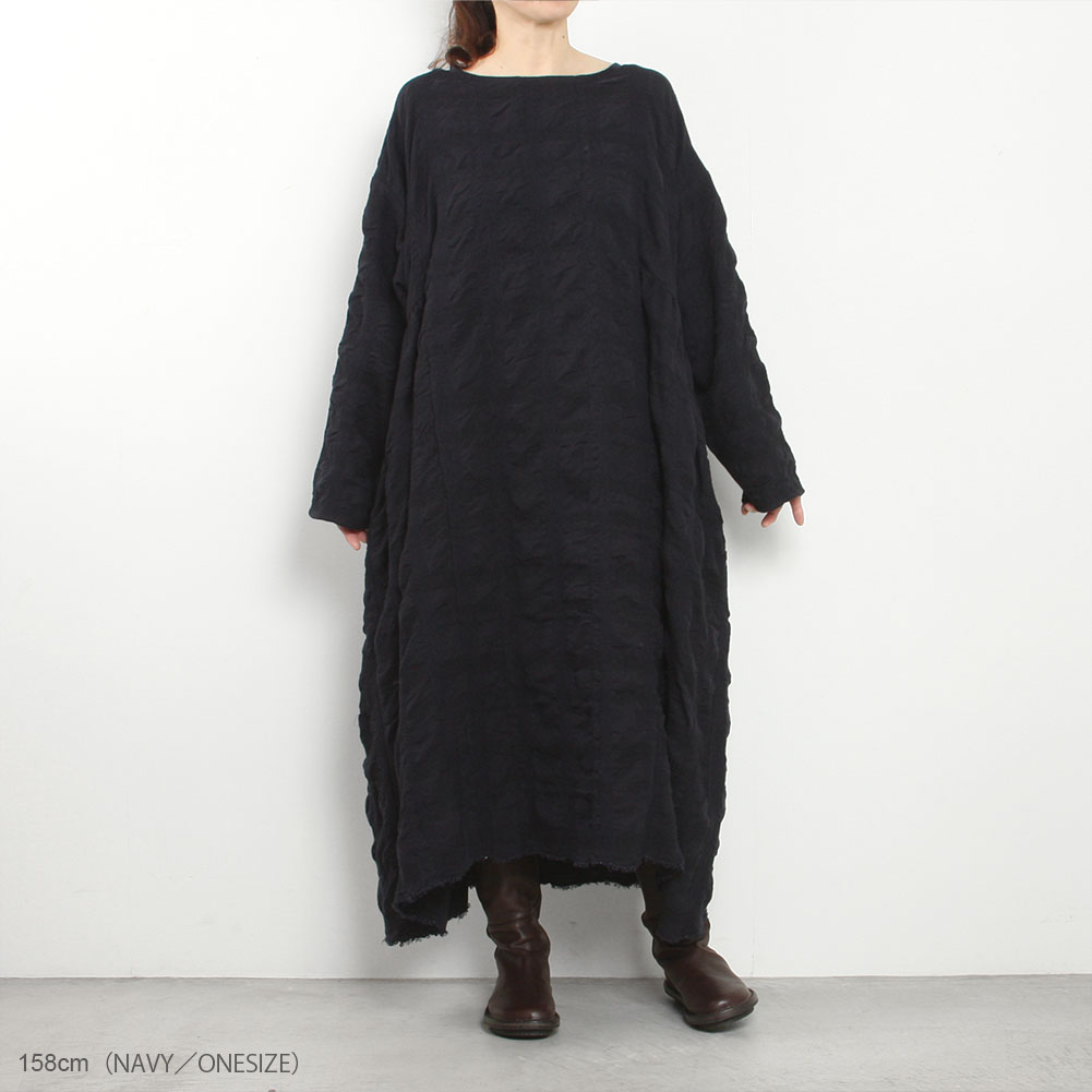 ふっくら柔らかなコットンウール生地を使用したワンピース。格子状の織り模様が印象的で、とても雰囲気があります。身体をすっぽり包み込むゆったりしたデザインに加え、サイドにギャザーを施すことでどの角度から見ても動きのあるシルエットに。裾はあえてフリンジ状にすることで程よく抜け感があります。ポケットが付いているのも嬉しいポイントですね。冬にはタートルネックなどインナーを重ねていただくとシーズン長く活躍します。