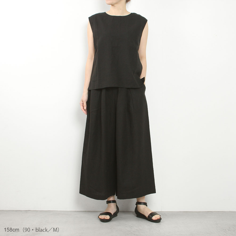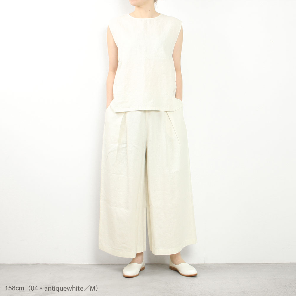 糸を水にくぐらせながらゆっくりと撚りをかけた水撚りリネンは、上質で自然ななめらかさのあるリネン生地となります。フロントにタックを施し、裾にかけて広がるボリュームのあるシルエットはシンプルなトップスと合わせても雰囲気があります。さらっとした肌触りが涼しく汗ばむ季節はもちろん、丈が長めなのでシーズン長く活躍します。
