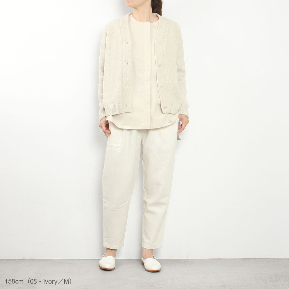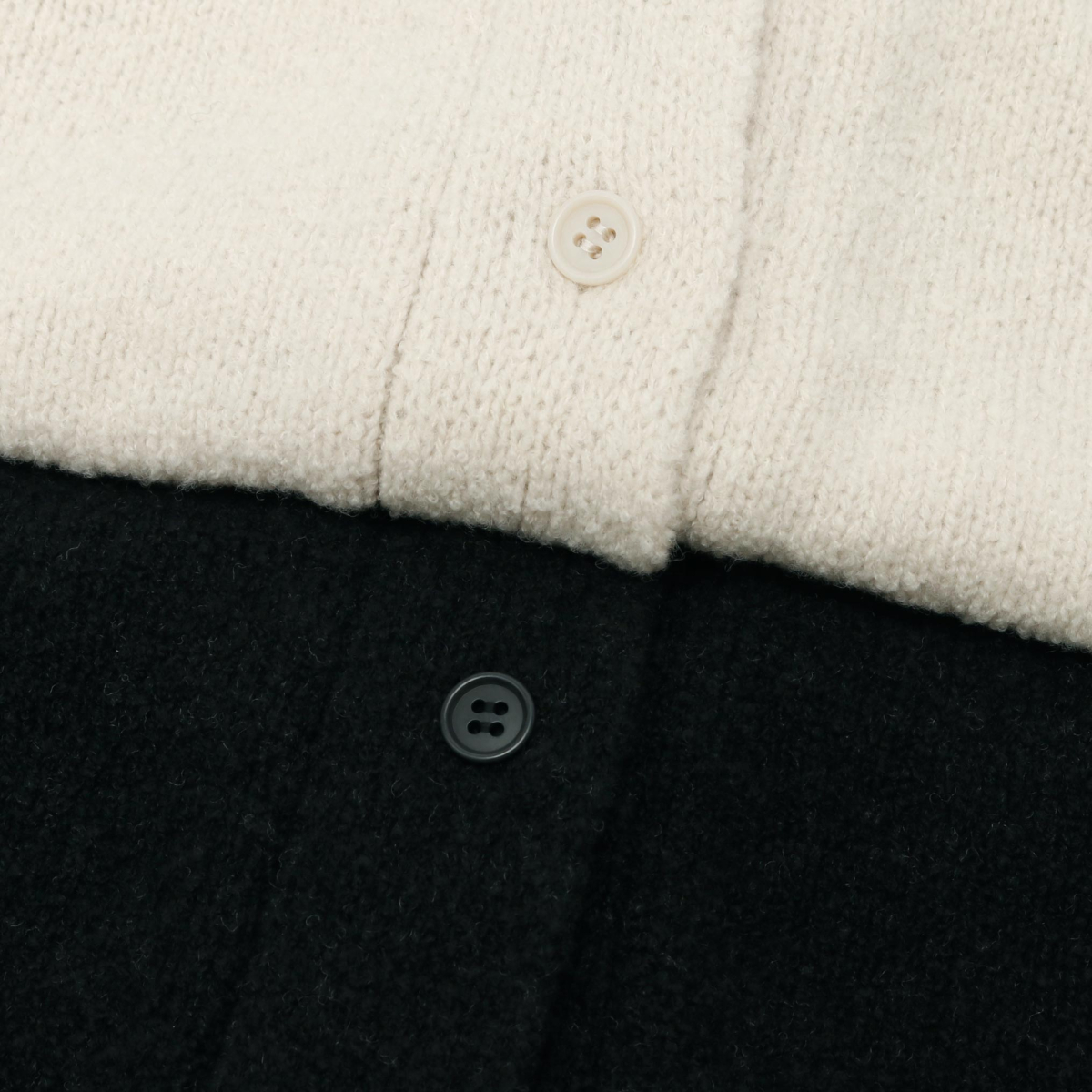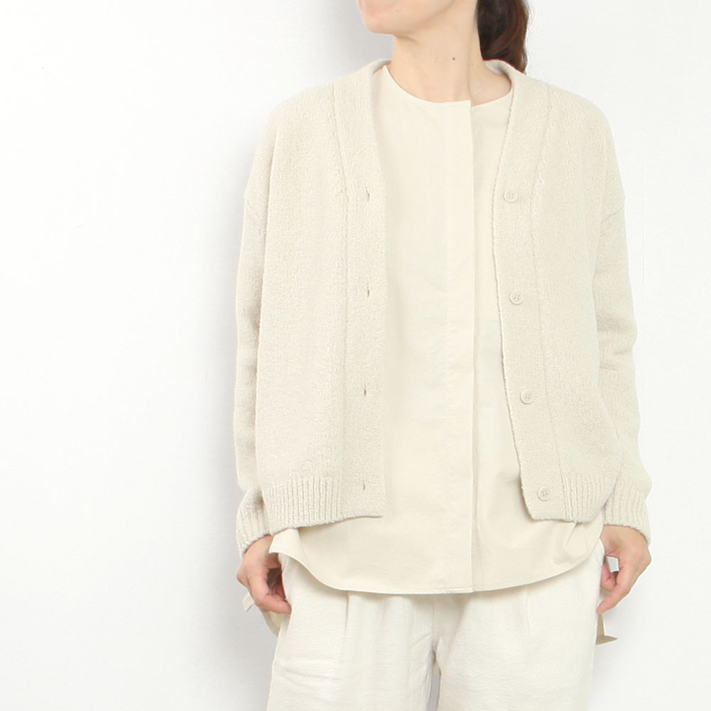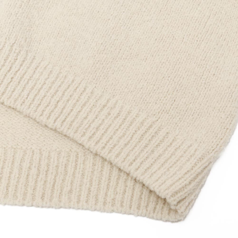 定番のプレスウールシリーズから残る端材を粉砕して、新たな糸に生まれ変わったrenew-wool。今季はウールの連続した細かいループ糸と組み合わせることで、密度がありながらも軽さとあたたかみのある仕上がりに。ざっくりした編み地が優しい風合いで、ゆったりとしたサイズ感が空気を含みあたたかく着ていただけます。シャツやカットソー、薄手のニットなど重ね着が増えるこれからの季節にどうぞ。