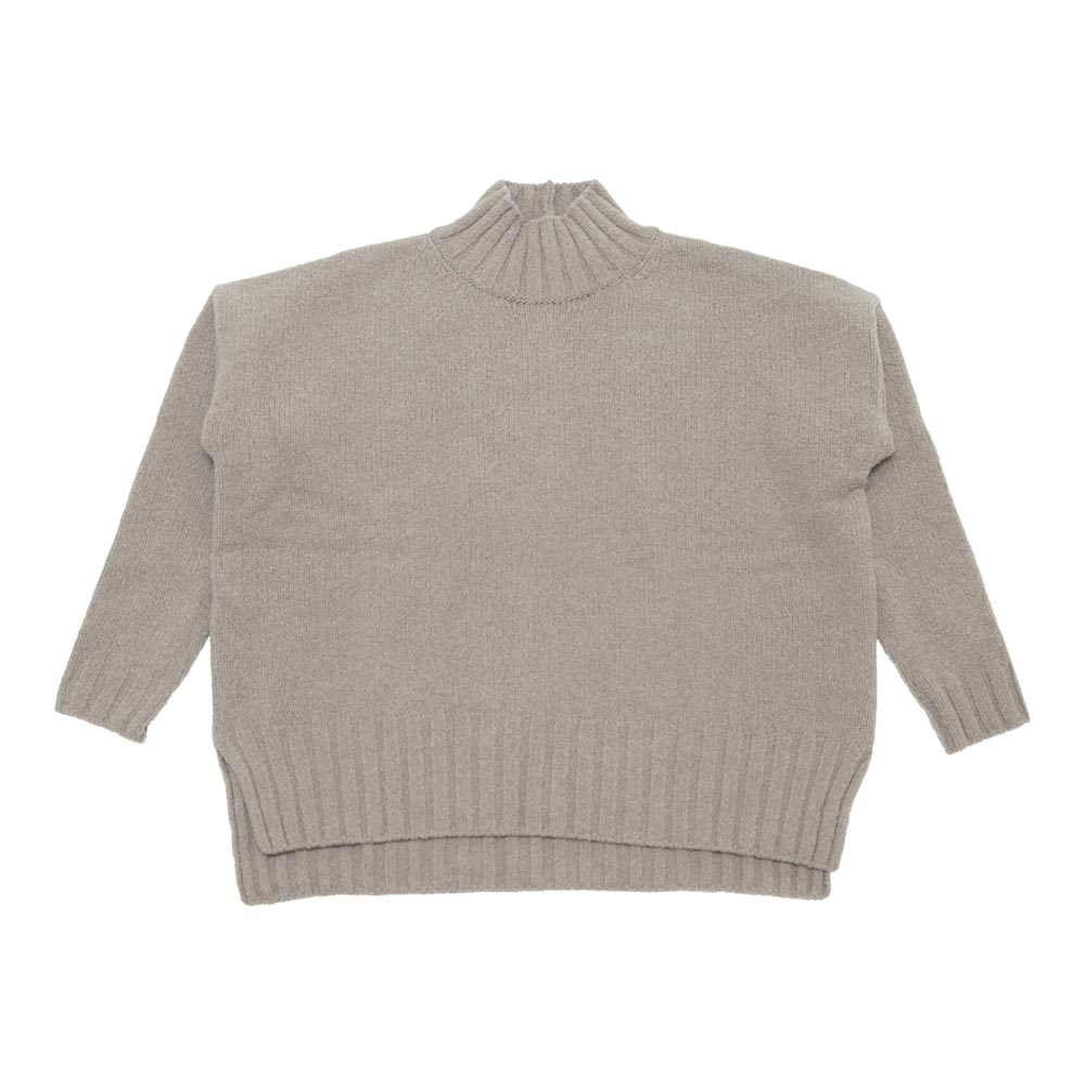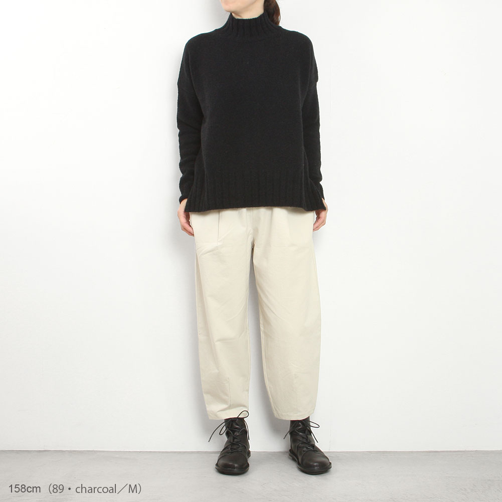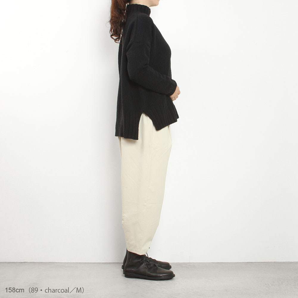 定番のプレスウールシリーズから残る端材を粉砕して、新たな糸に生まれ変わったrenew-wool。今季はウールの連続した細かいループ糸と組み合わせることで、密度がありながらも軽さとあたたかみのある仕上がりに。ざっくりした編み地が優しい風合いで、ゆったりとしたサイズ感が空気を含みあたたかく着ていただけます。優しい肌当たりのタートルネックは、首元と裾のリブがいいアクセントになっています。