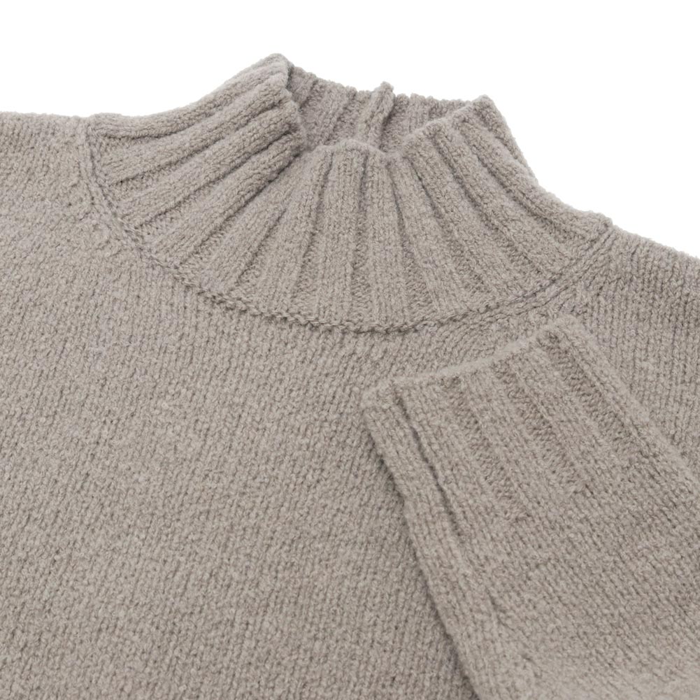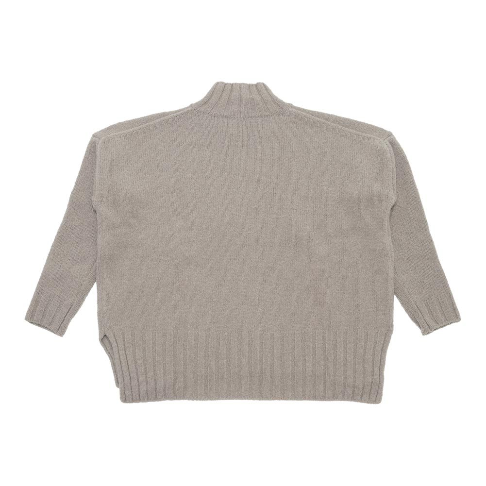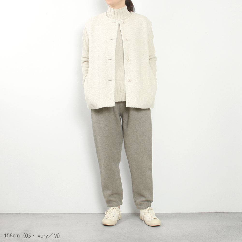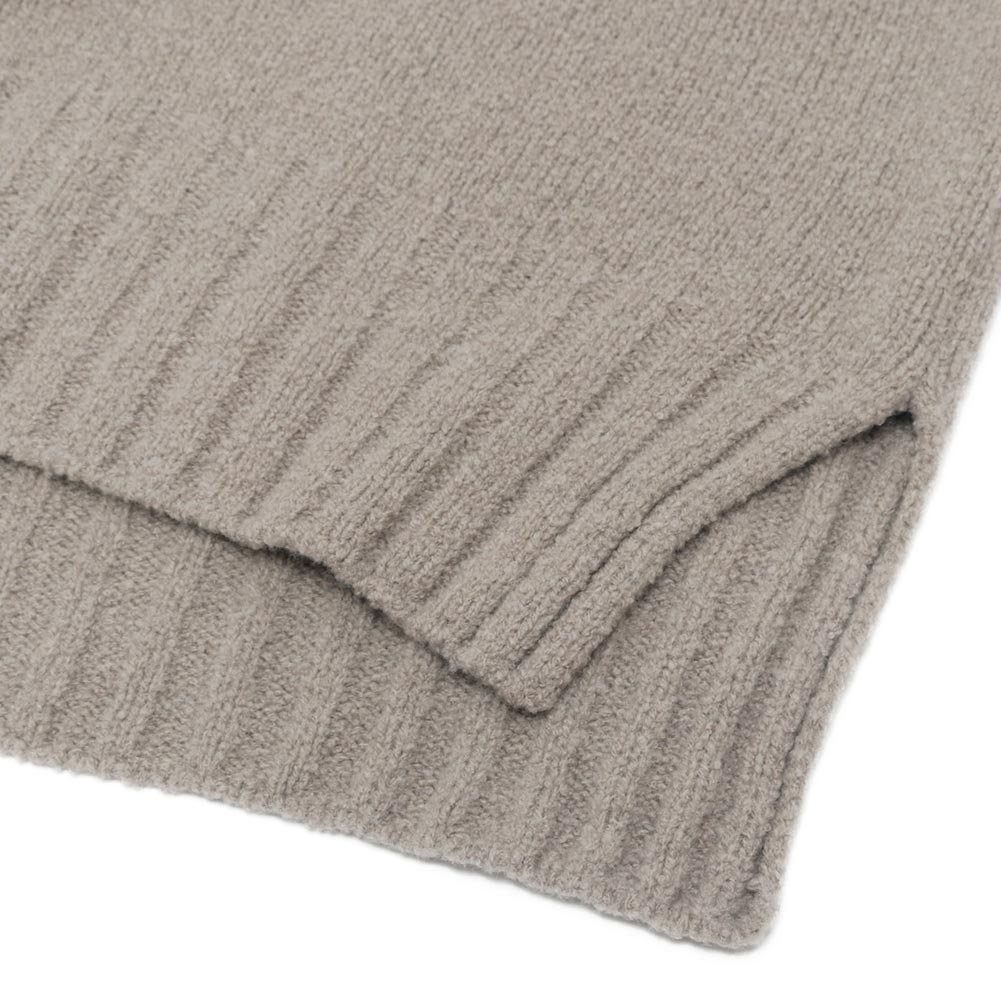 定番のプレスウールシリーズから残る端材を粉砕して、新たな糸に生まれ変わったrenew-wool。今季はウールの連続した細かいループ糸と組み合わせることで、密度がありながらも軽さとあたたかみのある仕上がりに。ざっくりした編み地が優しい風合いで、ゆったりとしたサイズ感が空気を含みあたたかく着ていただけます。優しい肌当たりのタートルネックは、首元と裾のリブがいいアクセントになっています。