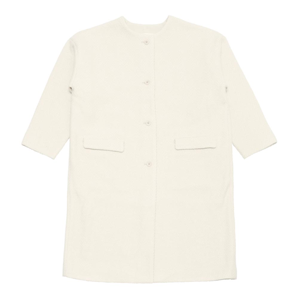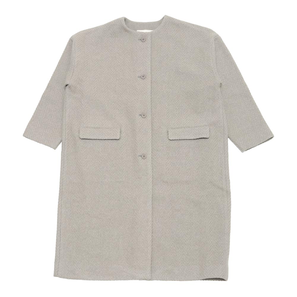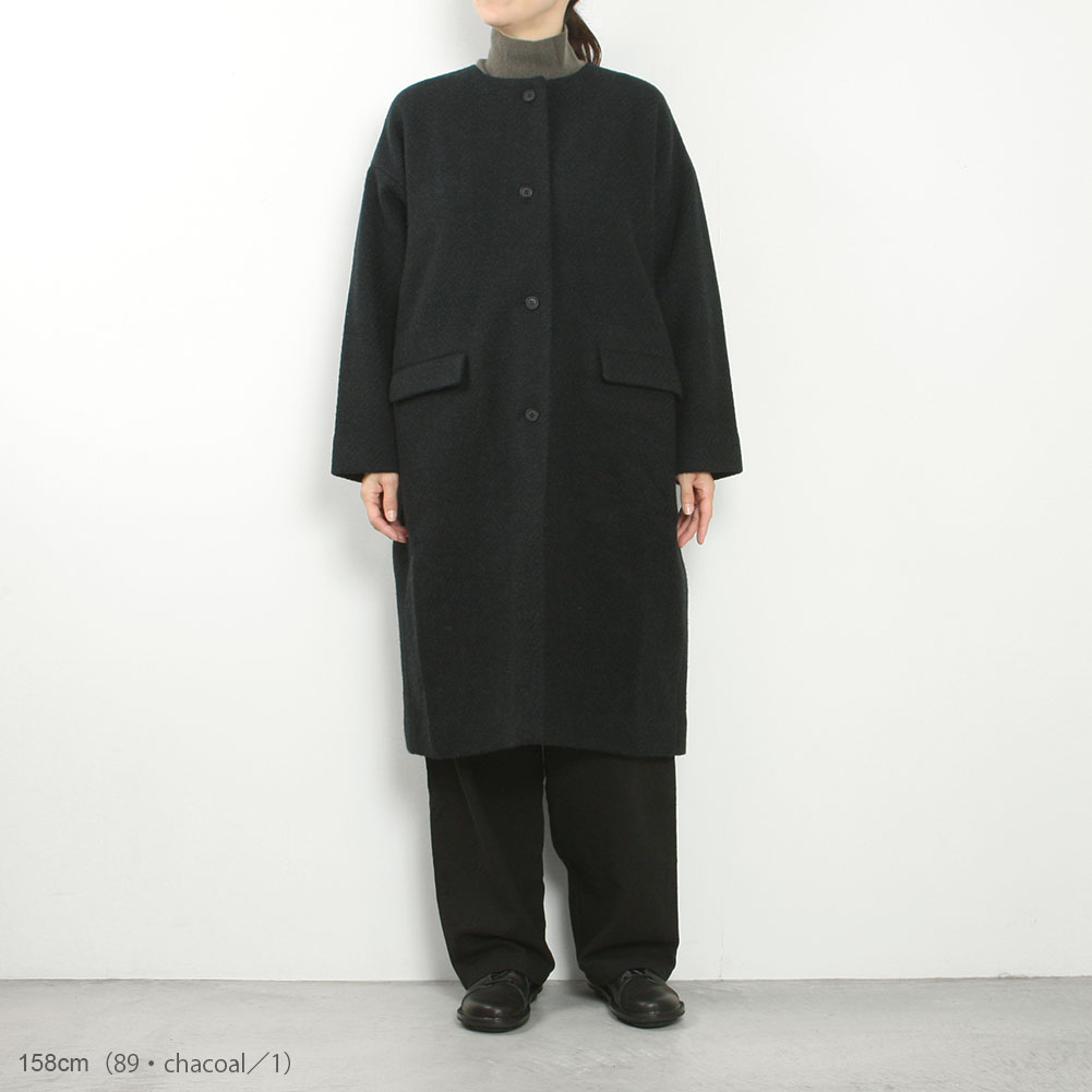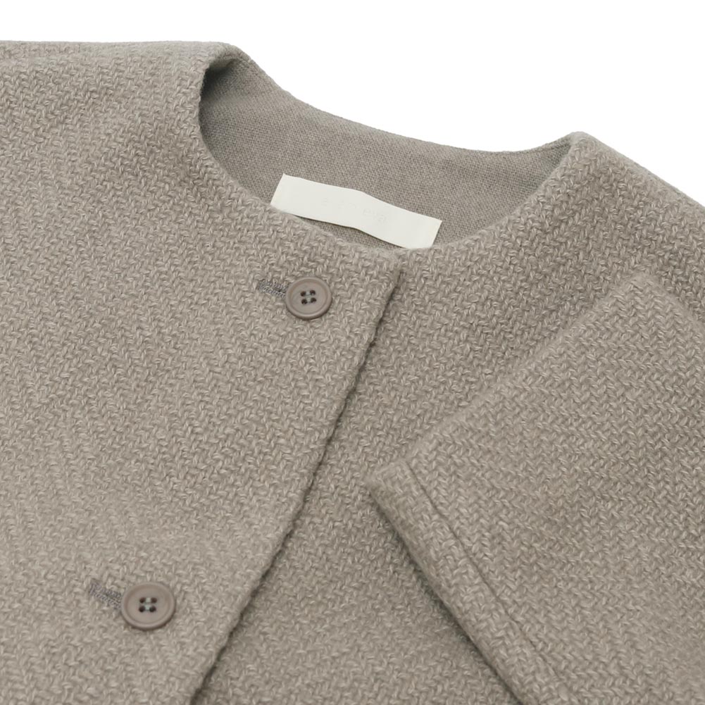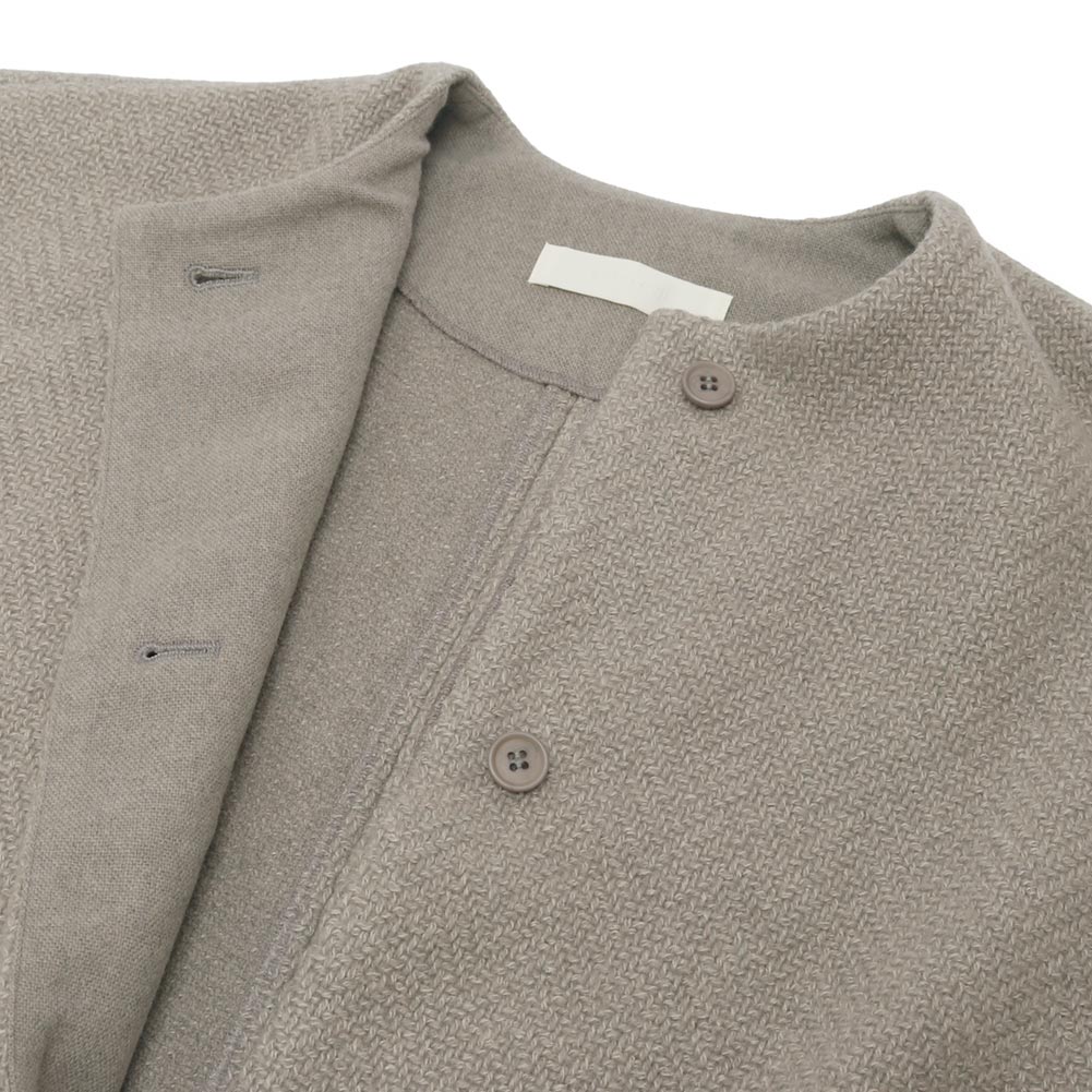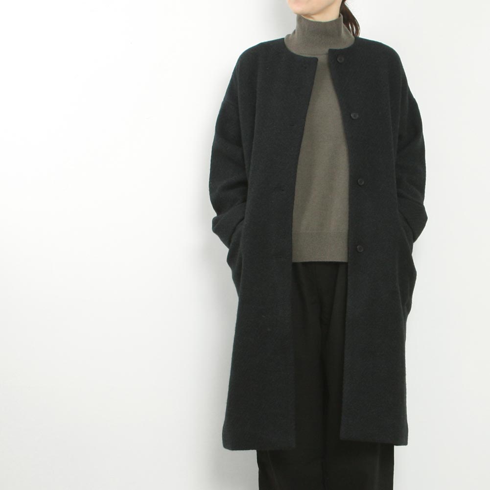 定番のプレスウールシリーズから残る端材を粉砕して、新たな糸に生まれ変わったrenew-wool。これまでニットでの展開でしたが今季からアウターシリーズが新たに加わりました。renew-woolの太番手の織り糸とシルクの糸が織りなす独特の風合いは見た目にもあたたか。ゆとりのある腕周りは厚手になるこれからの季節に羽織やすく、すとんと落ちるストレートシルエットが上品な雰囲気です。首周りがすっきり見えるノーカラーはタートルネックとも好相性です。