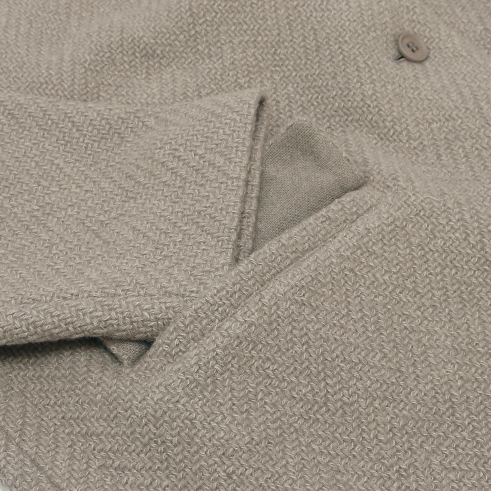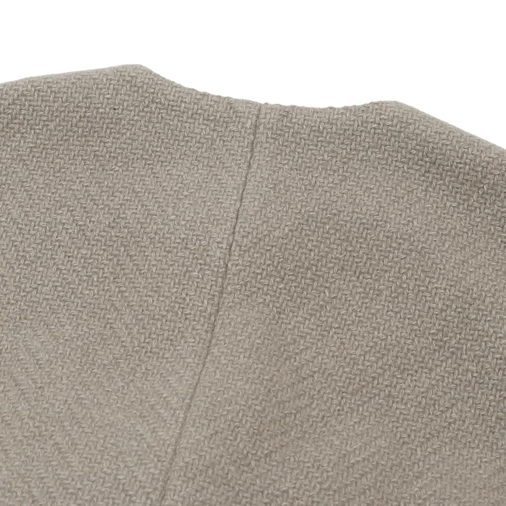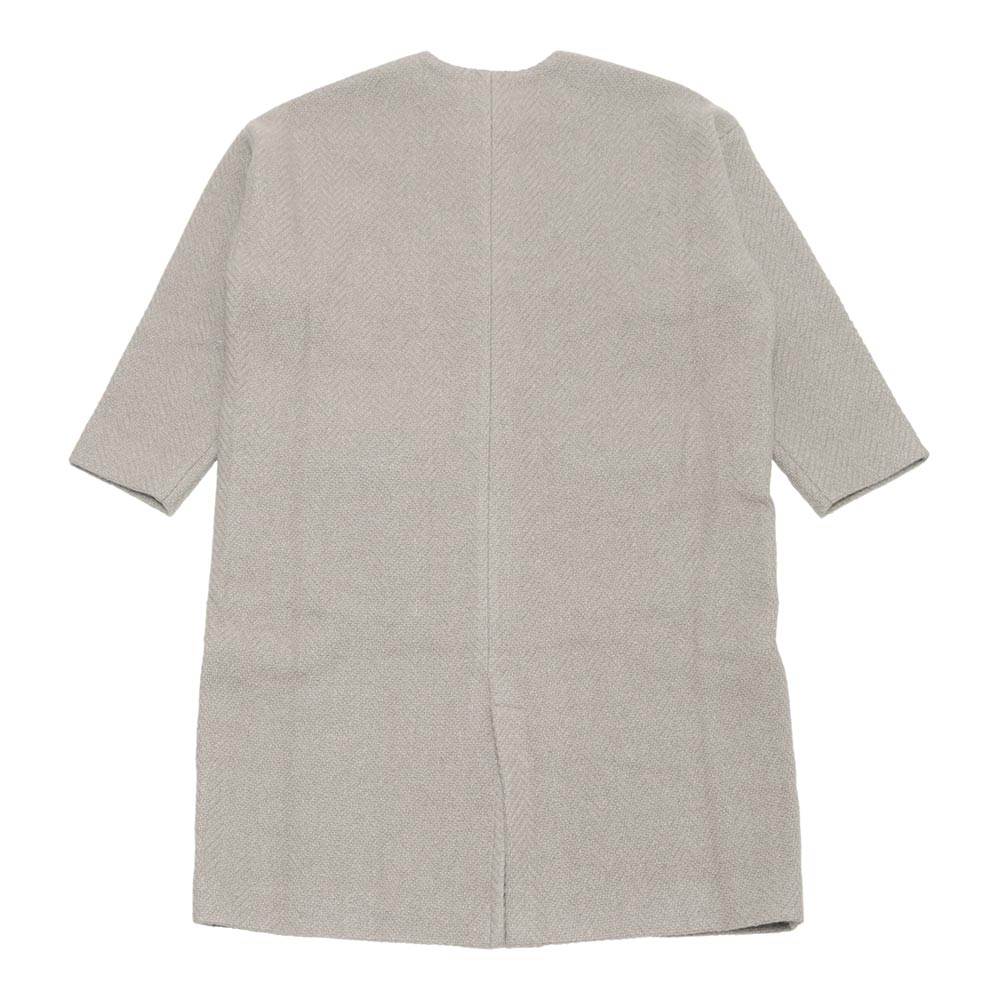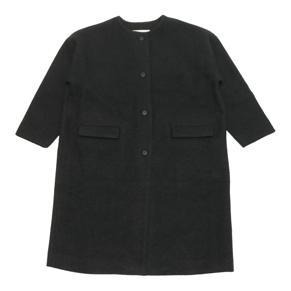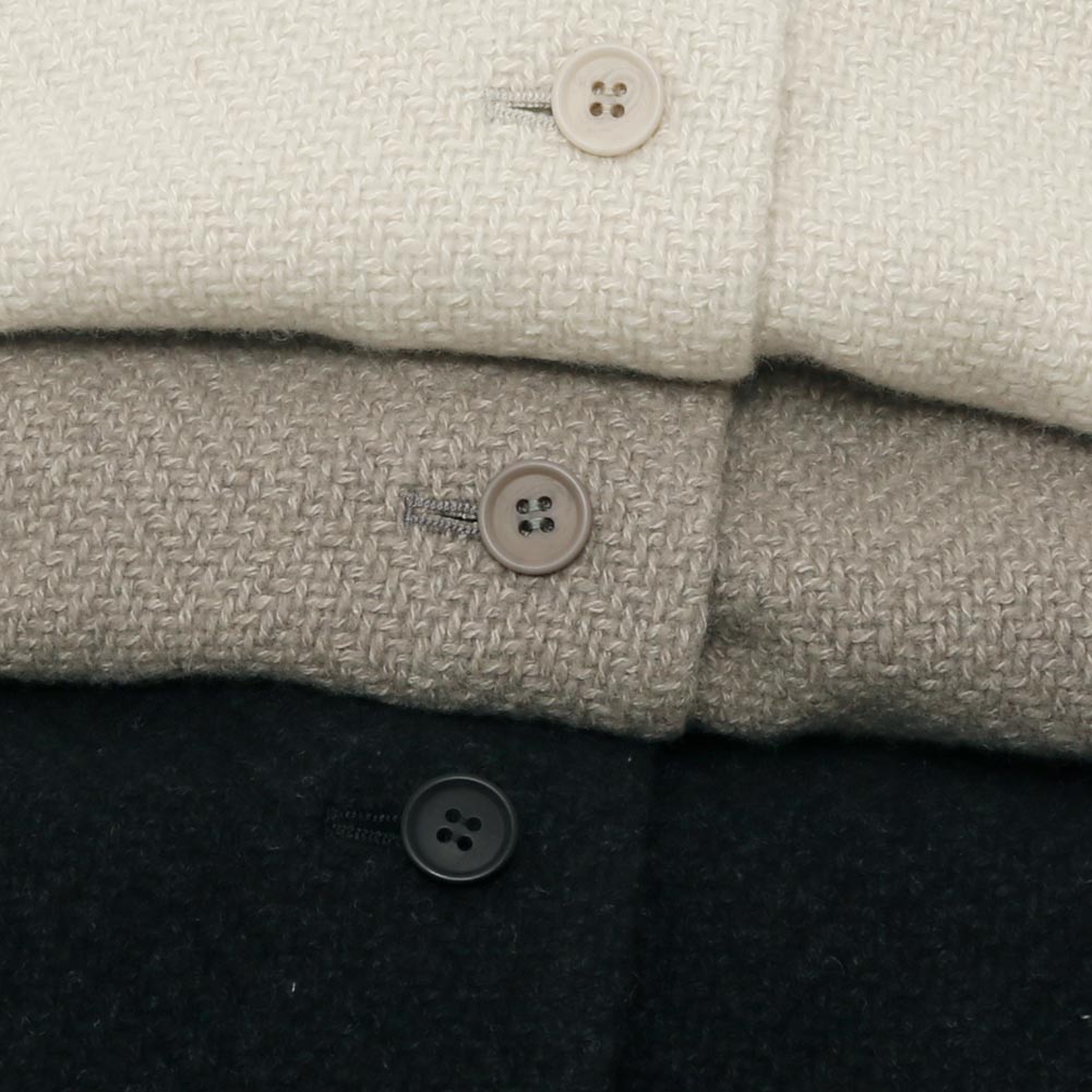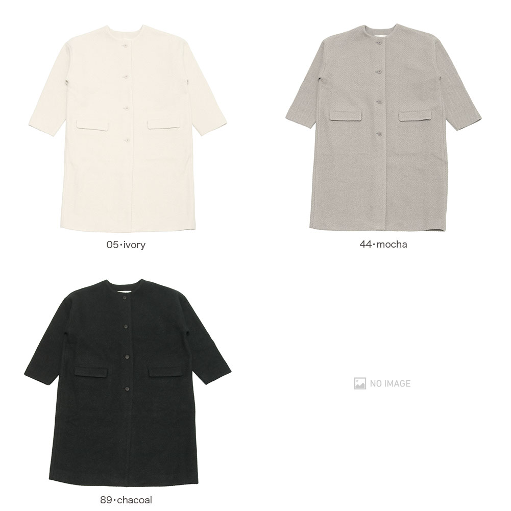 定番のプレスウールシリーズから残る端材を粉砕して、新たな糸に生まれ変わったrenew-wool。これまでニットでの展開でしたが今季からアウターシリーズが新たに加わりました。renew-woolの太番手の織り糸とシルクの糸が織りなす独特の風合いは見た目にもあたたか。ゆとりのある腕周りは厚手になるこれからの季節に羽織やすく、すとんと落ちるストレートシルエットが上品な雰囲気です。首周りがすっきり見えるノーカラーはタートルネックとも好相性です。
