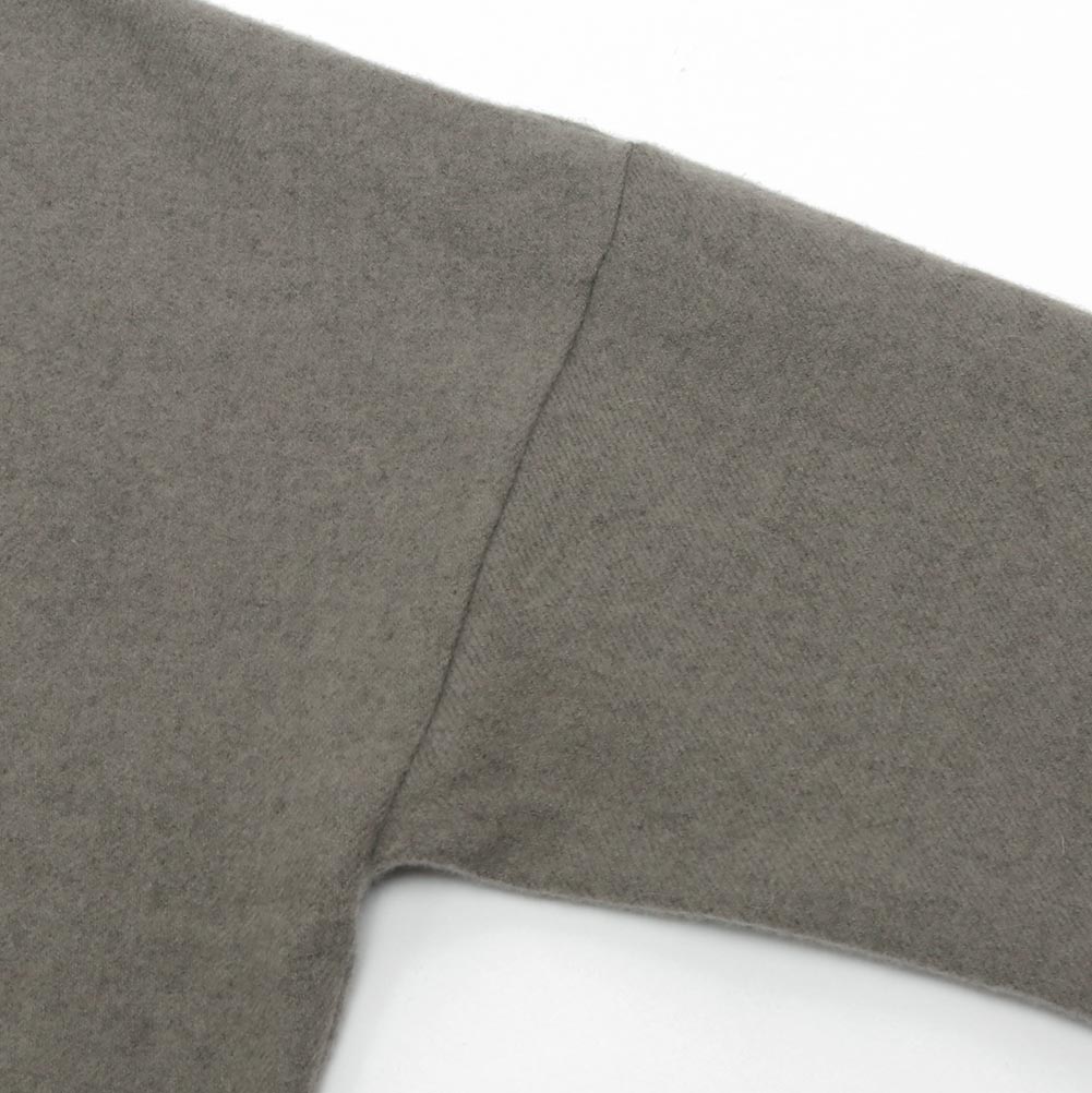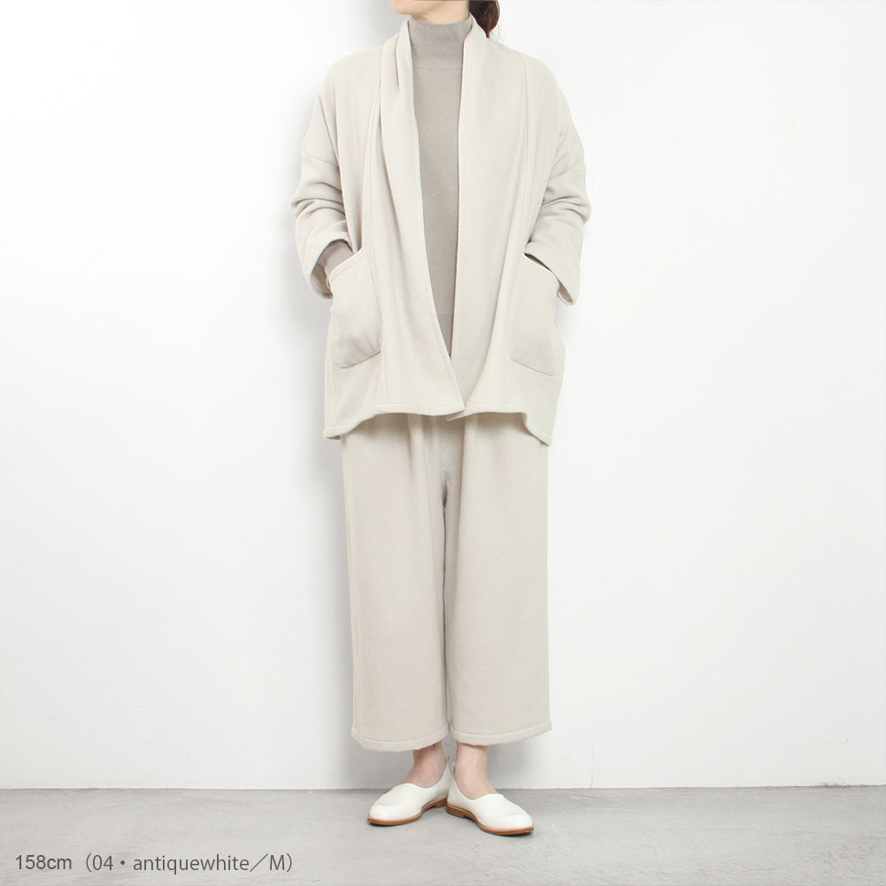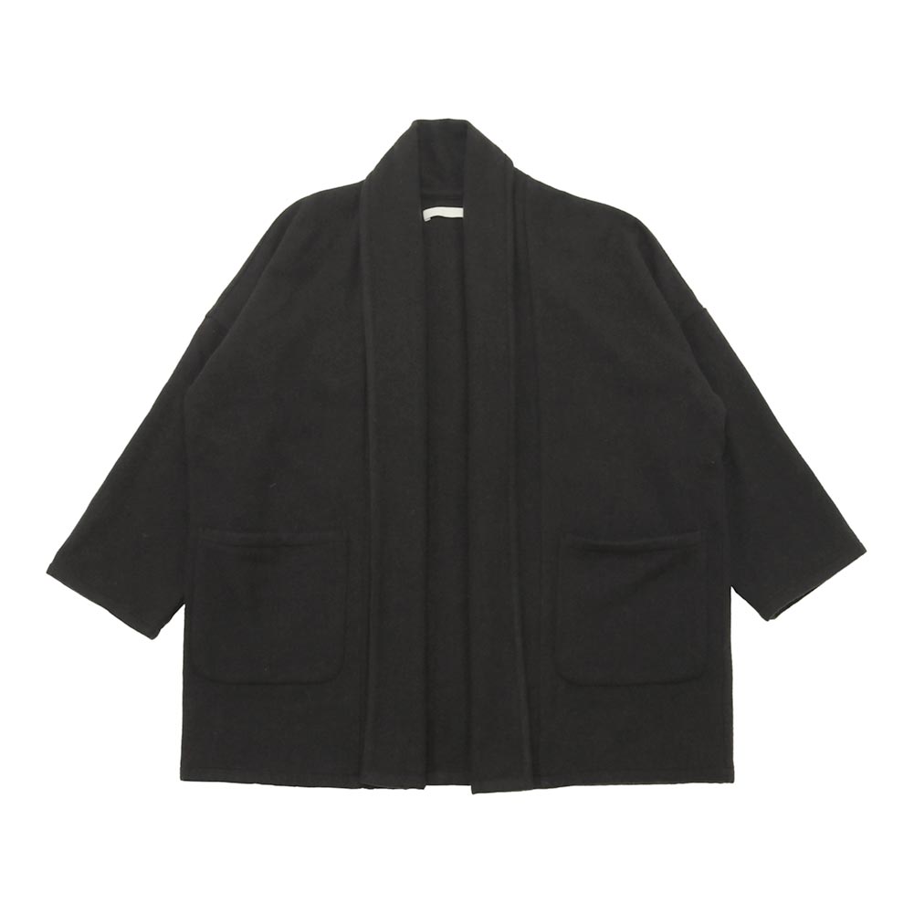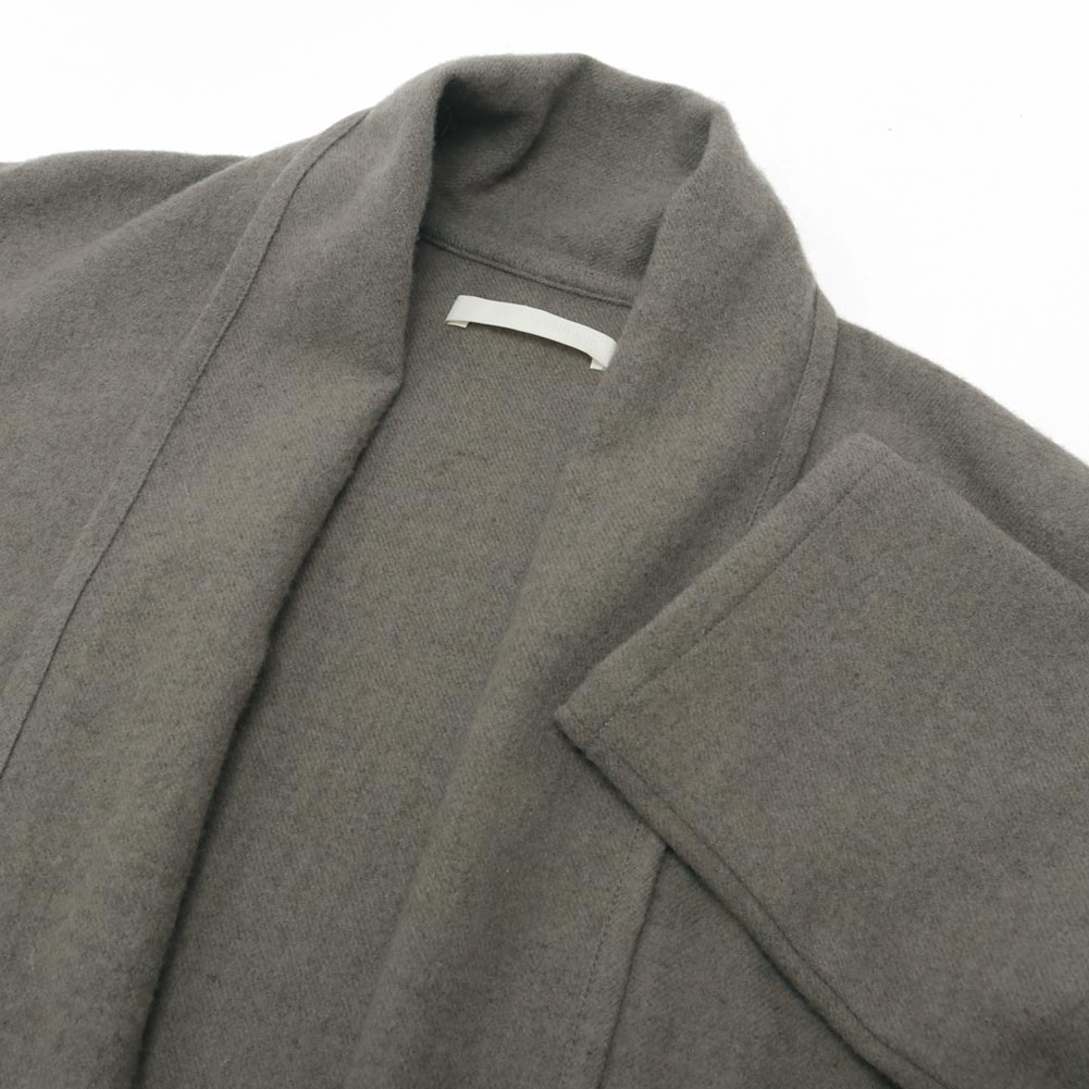 本来はニットに利用される甘撚りの糸を織り生地に使用したショートローブ。甘く撚ることで空気を含み、あたたかで軽い穿き心地に仕上がっています。腕周りにゆとりがあるのでニットなど嵩があるものと合わせてもごわつきにくいです。カーディガン感覚で気軽に羽織れるショートローブはライトアウターとして活躍します。