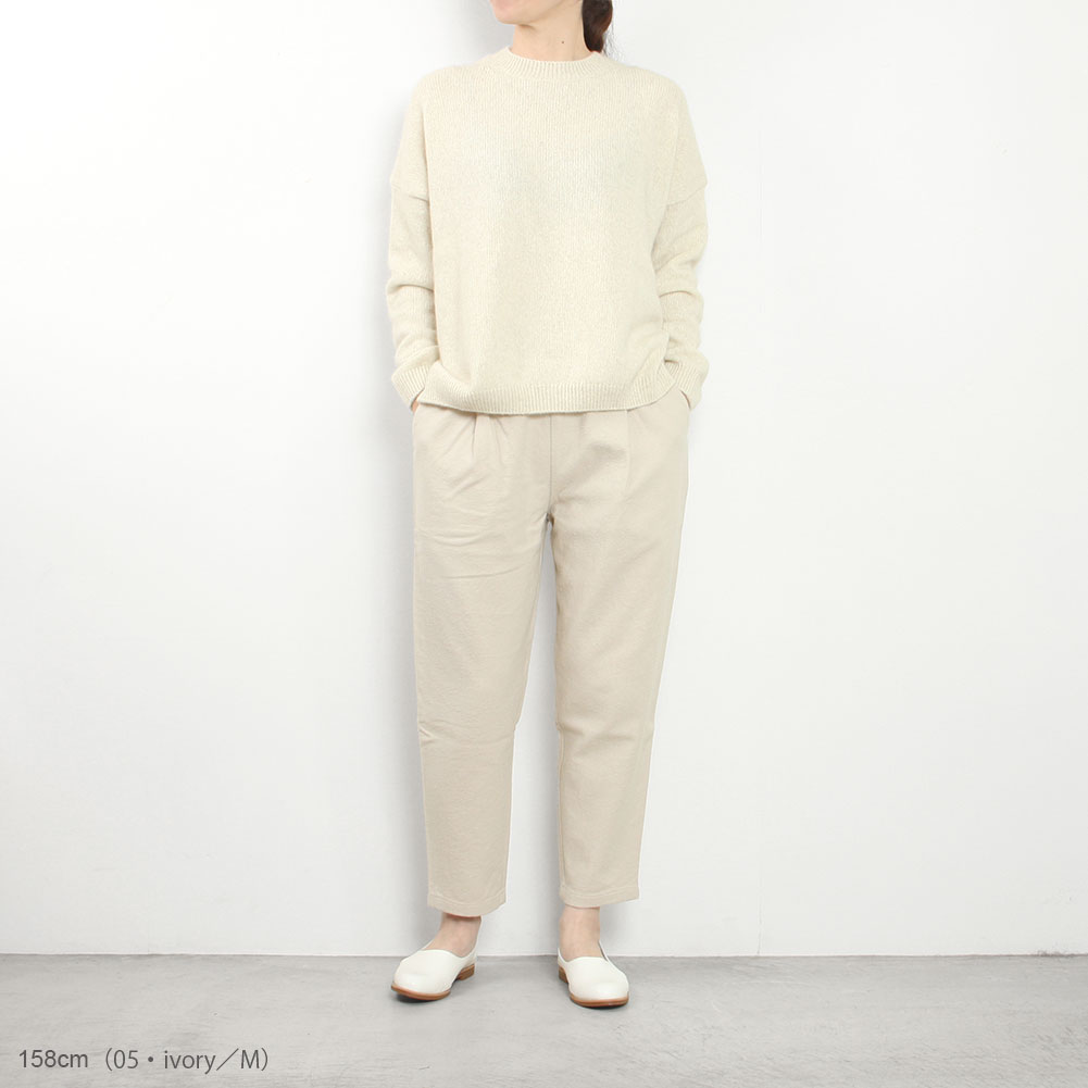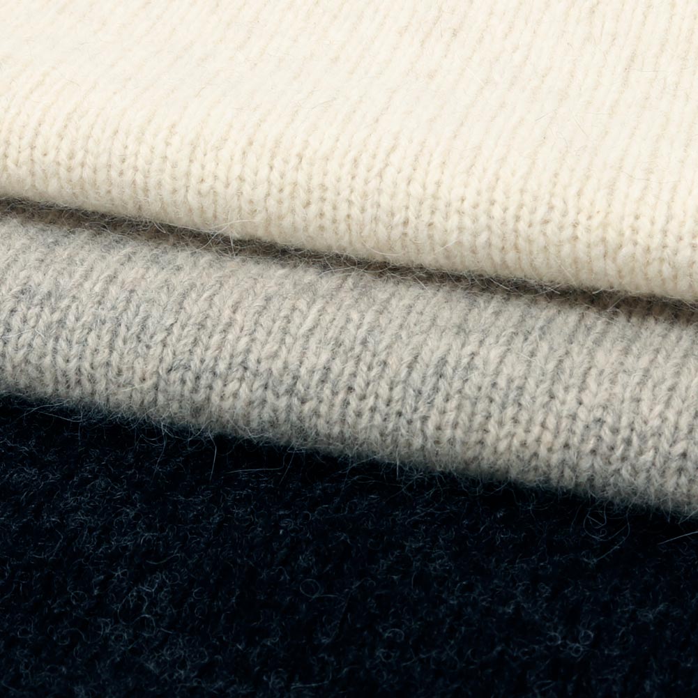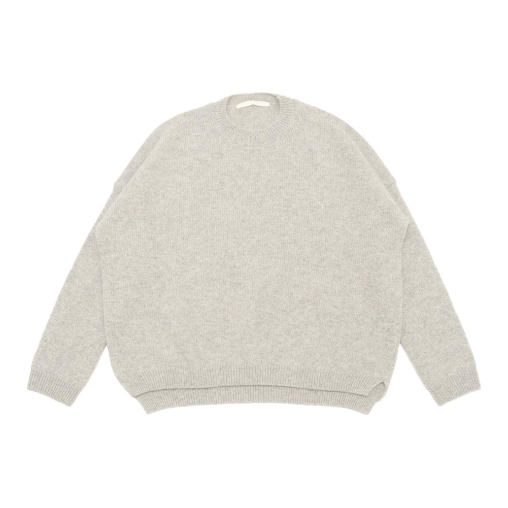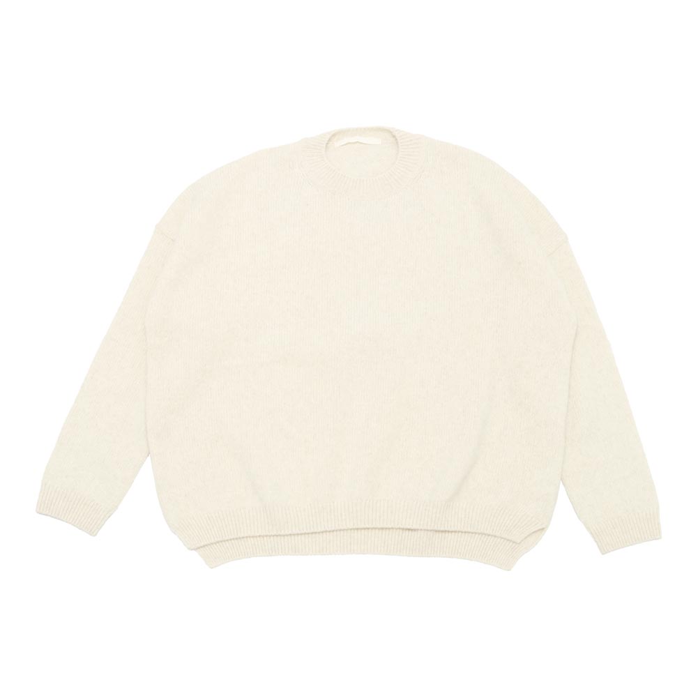 メリノウールと優しい肌あたりのブルーフォックスをブレンドしたふわりと軽い着心地のプルオーバー。数色の綿を混ぜ合わせて染色しているため、ナチュラルで味わい深い色合いに仕上がっています。シンプルなデザインですが、所々に施されているリブや裾のスリットなど細かいディテールにもこだわった一枚です。