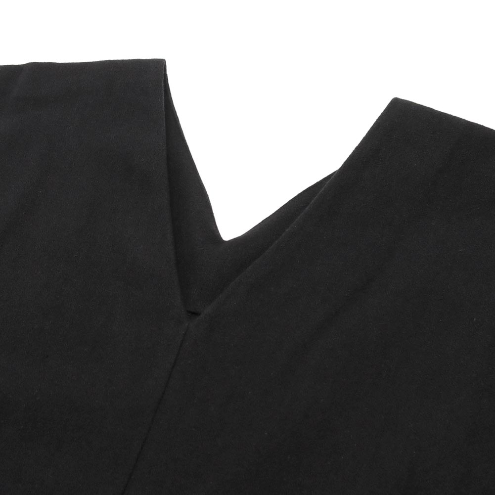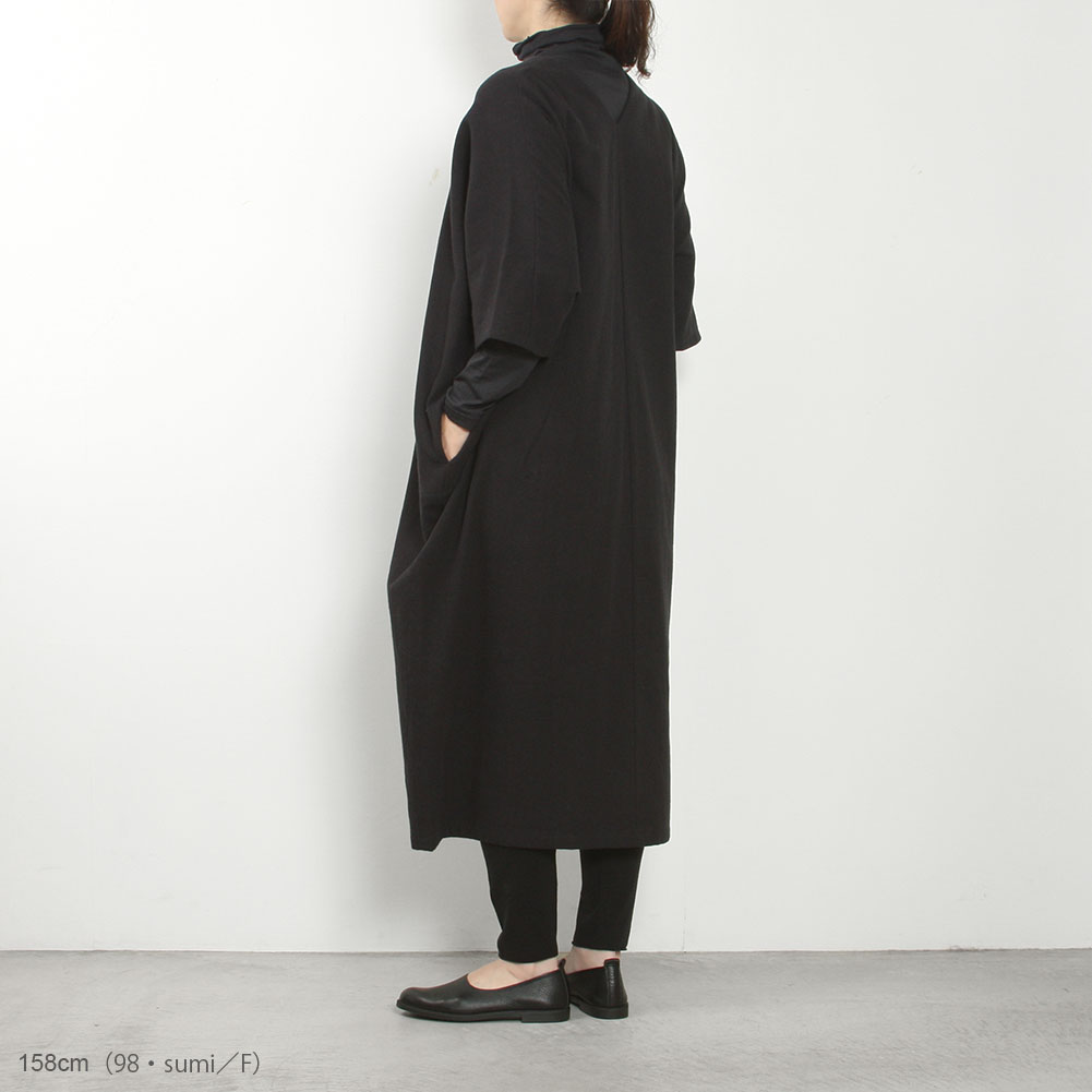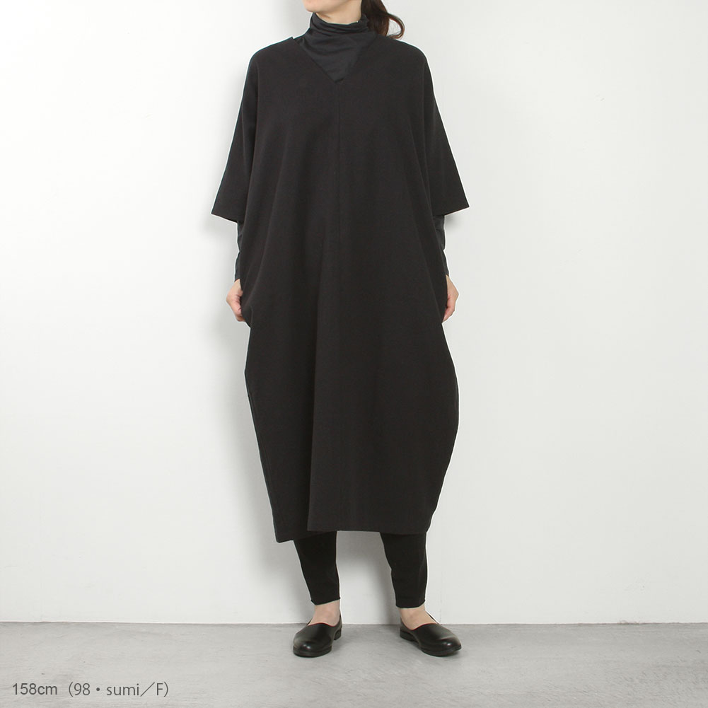 自然なドレープが女性らしいシルエットをつくるワンピース。ふくらみのある梨地織の生地は見た目にもあたたかな印象です。前後に開いたVネックがお顔周りをすっきりと見せ、今の季節には重ね着を愉しむことができます。