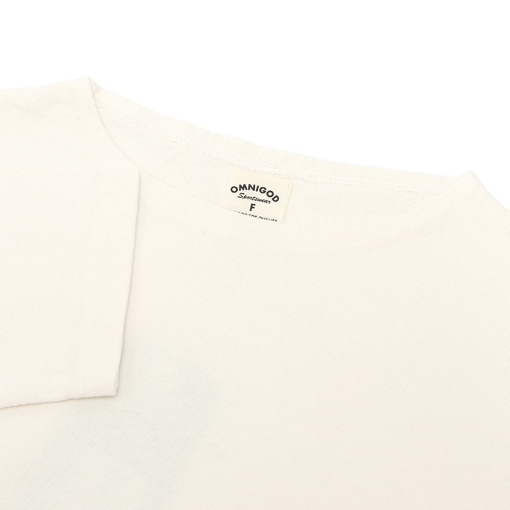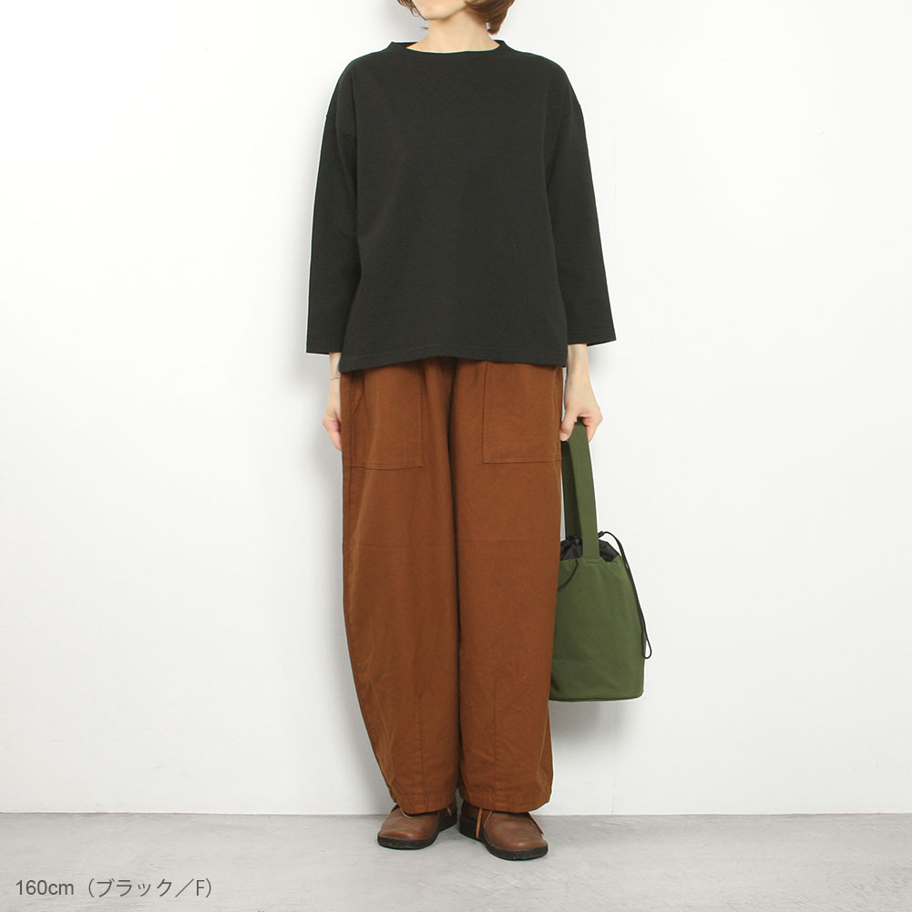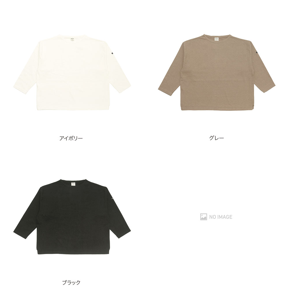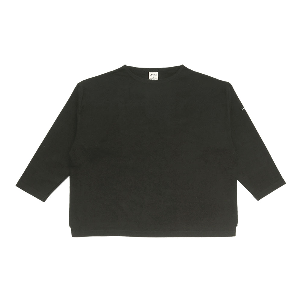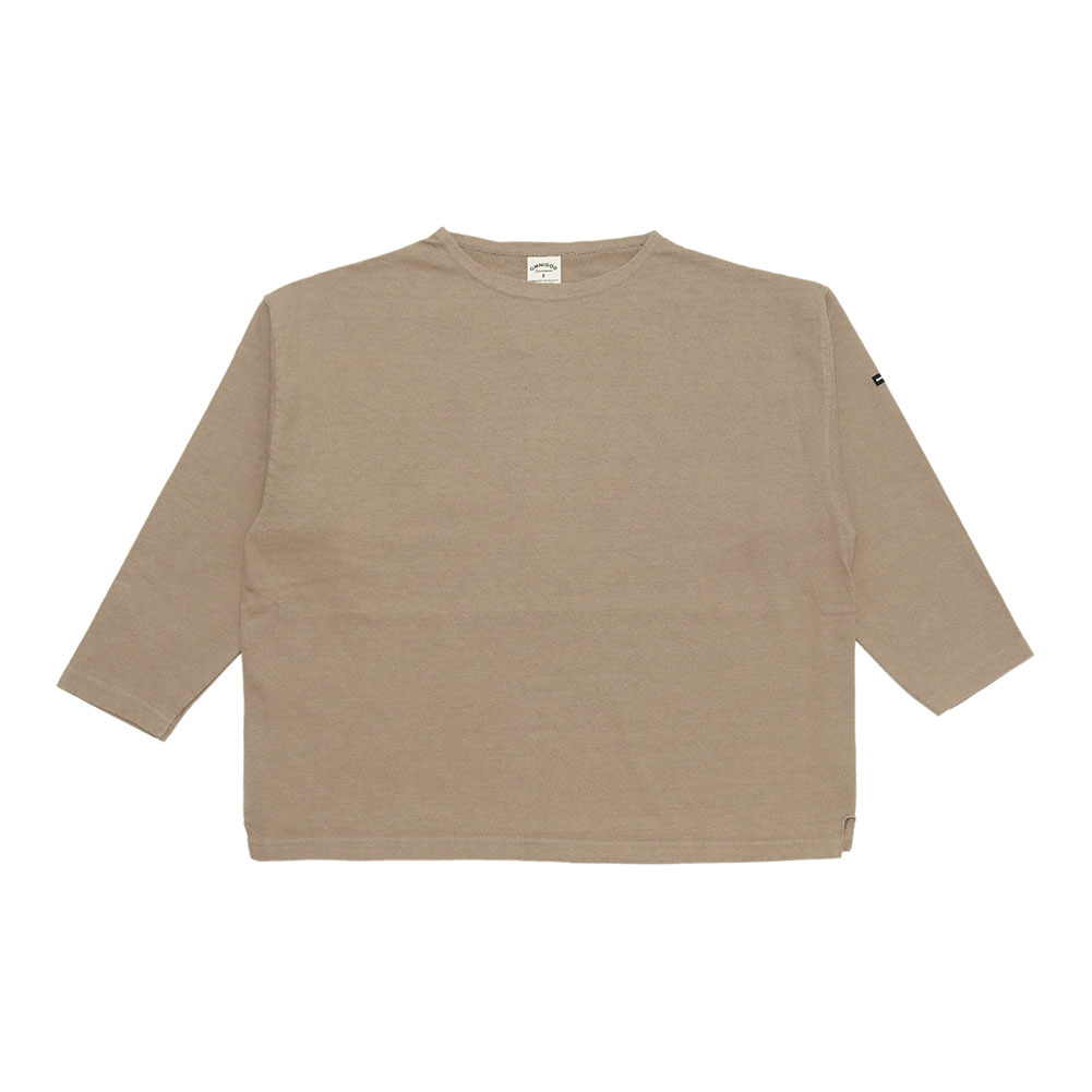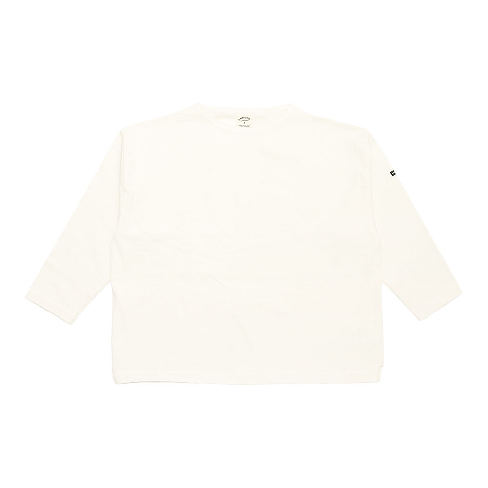 すっきりとしたボートネックは、横から見ると首筋を長く見せてくれます。左袖にはブランドロゴをあしらい、ちょっとしたワンポイントに。肩幅と身幅にゆとりを持たせ、脇下から裾にかけて広がりながら落ちていき、筒状の編み機を使用しているためサイドシームがなく丸みのあるワイドシルエットが独特のスタイルを演出しています。