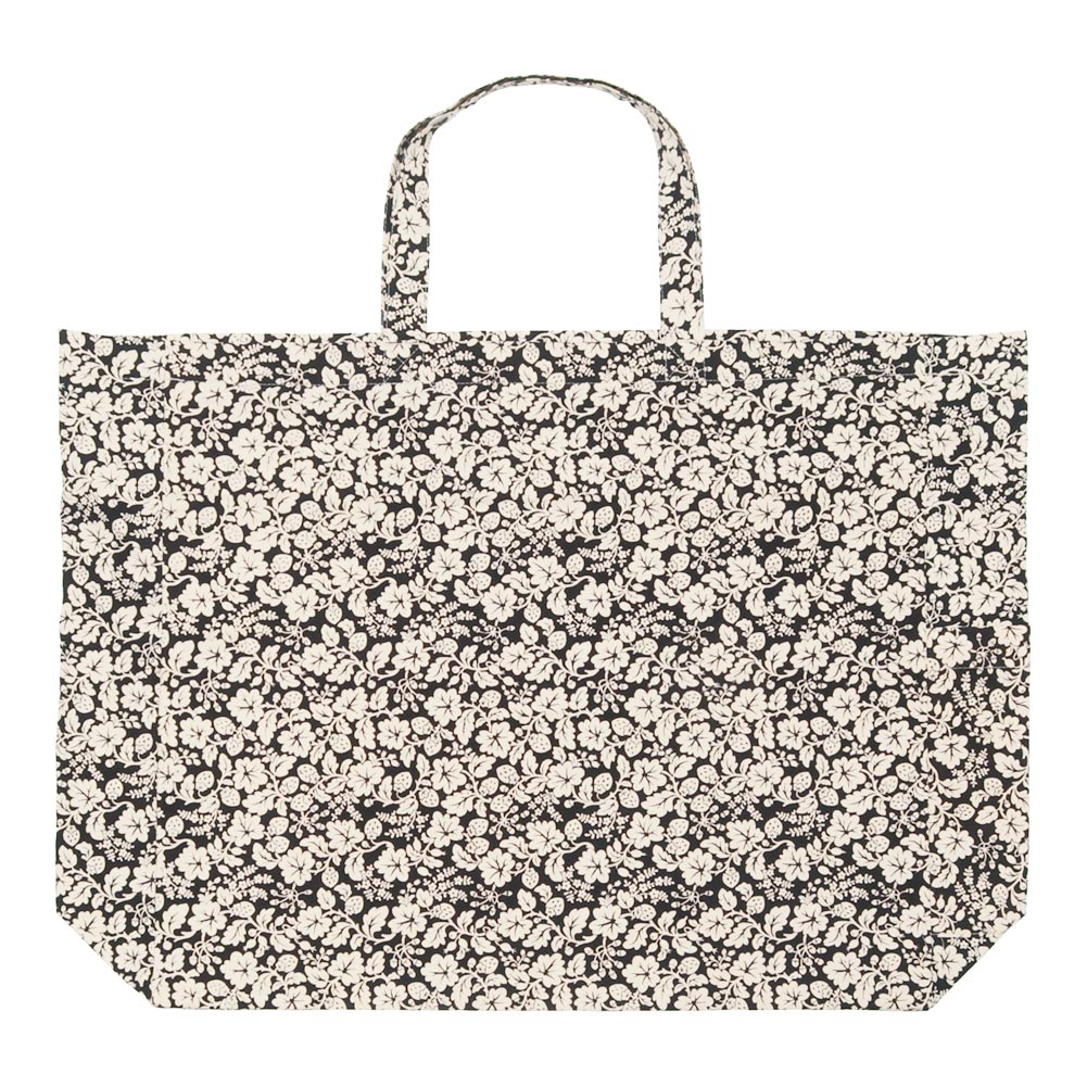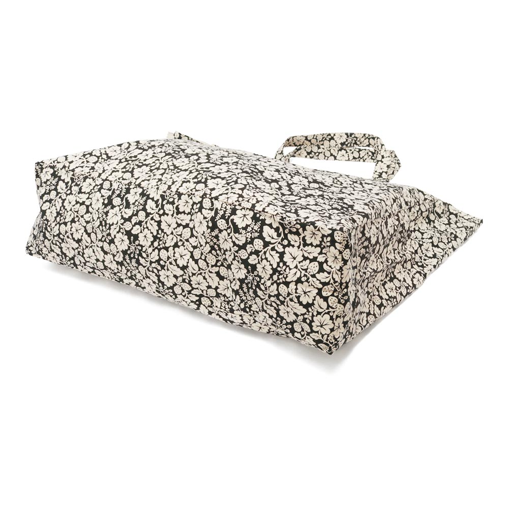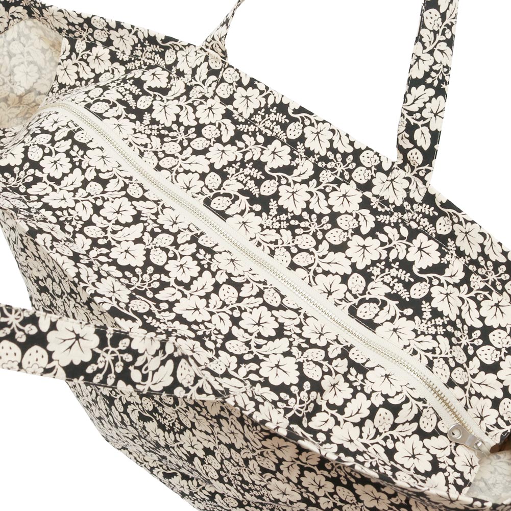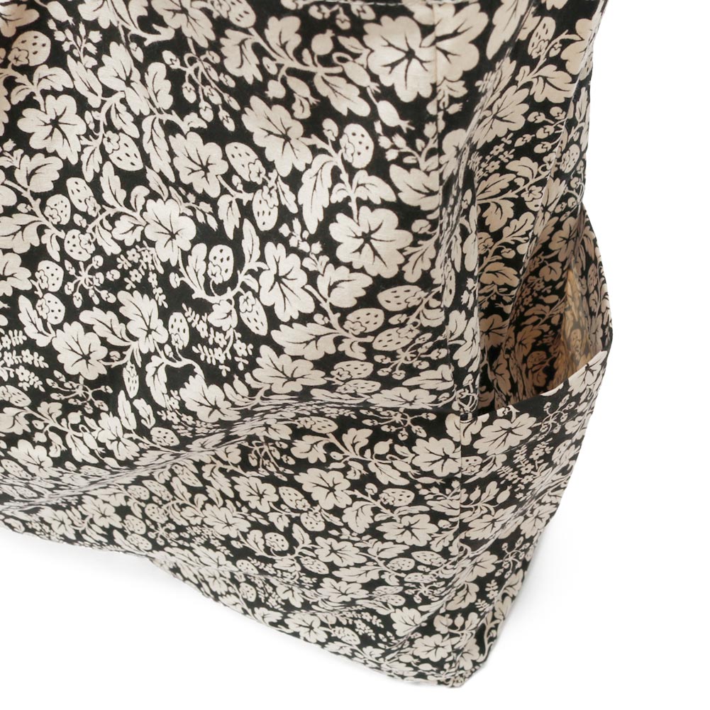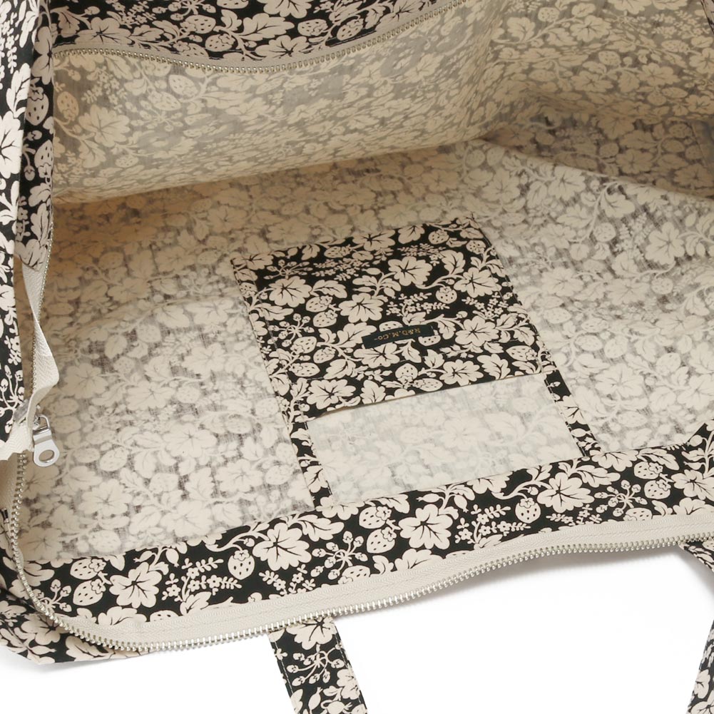 人気のWILD BERRY柄。しっかりとしたコットン素材になっています。バッグの上部にはジッパーが付いており安心して使っていただけます。横マチ部分にポケットがひとつ付いているのも便利で嬉しいポイント。マチがあり容量も豊富なので、メインバッグとしてもサブバッグとしても使っていただけそうです。