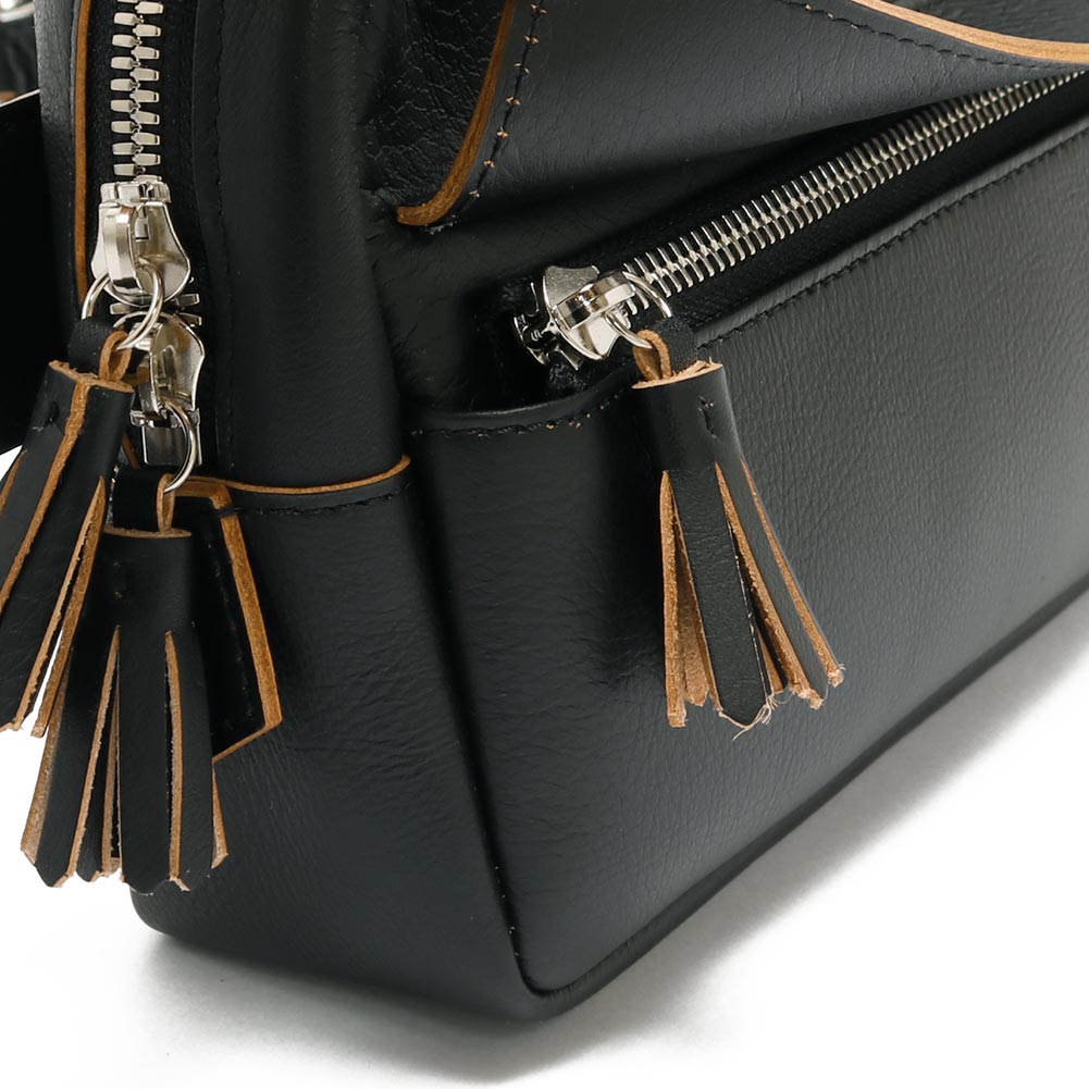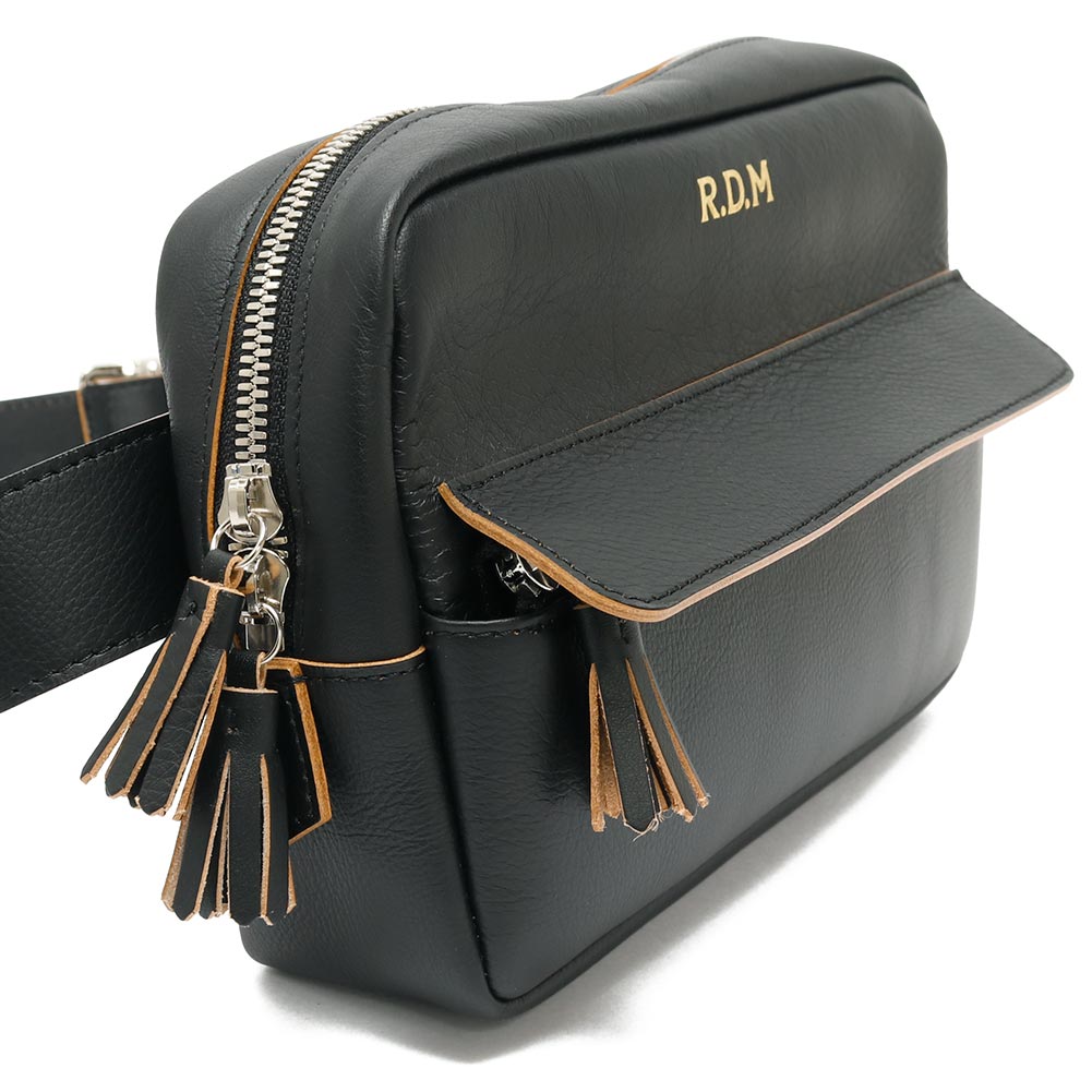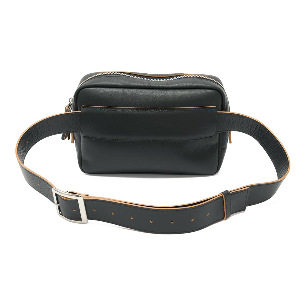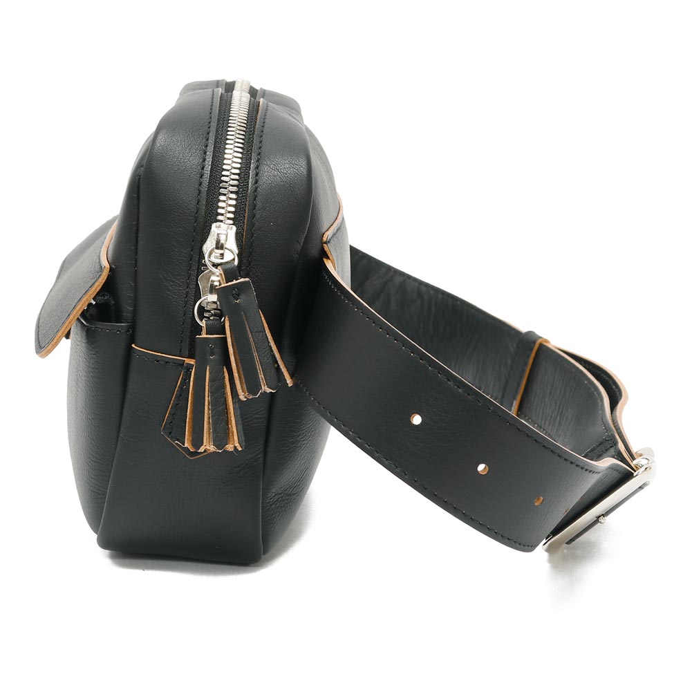 柔らかで馴染みのいい牛革を使用したボディバッグ。ショルダー部分は調節が効きますので、斜めがけや腰にぐるっと巻いてお使いいただけます。長財布のほか、携帯電話やハンカチ、ポーチなど必要なものは収まりそうです。また、フロントには細々したものを収納できるポケットがついています。ジップ持ち手のフリンジや、ゴールドの刻印もアクセントに。ある程度の荷物は入りつつ、嵩張らない程よいサイズ感が便利に使えるバッグです。