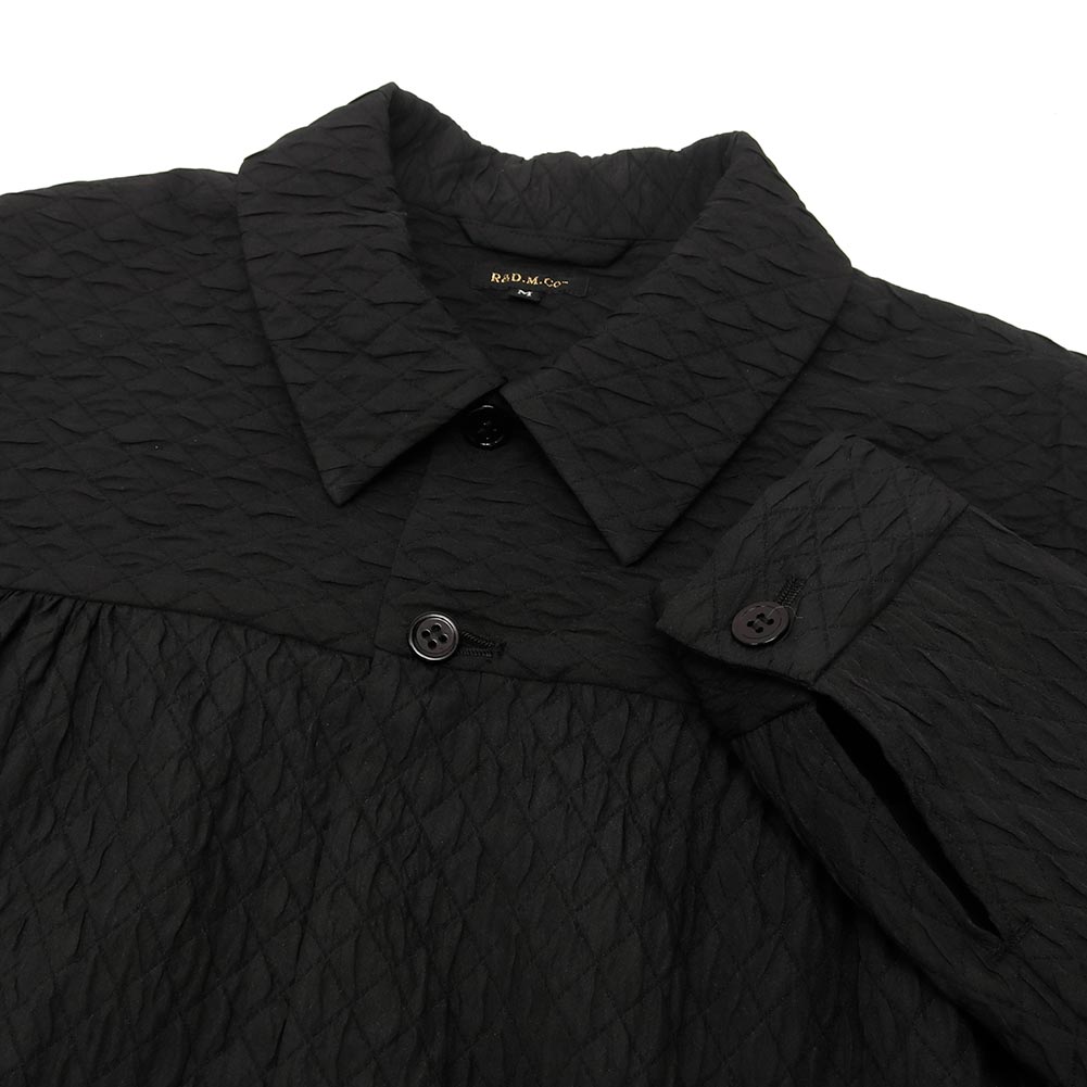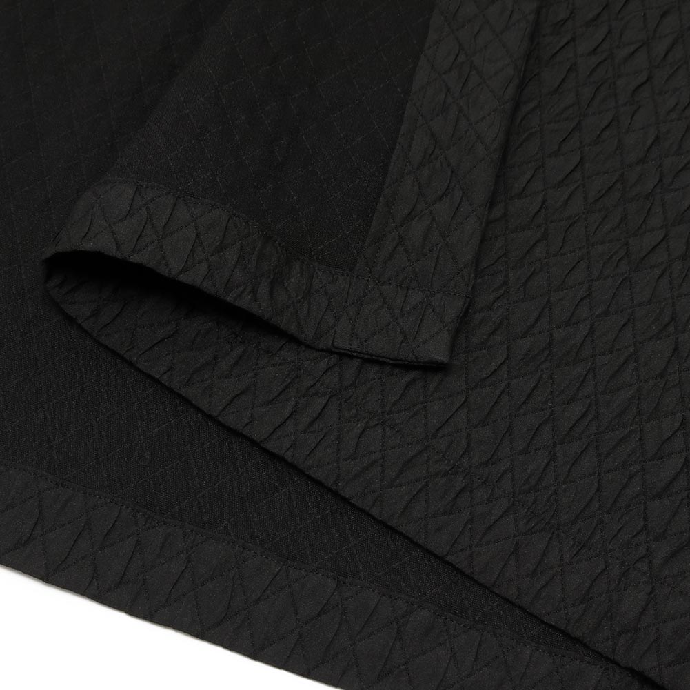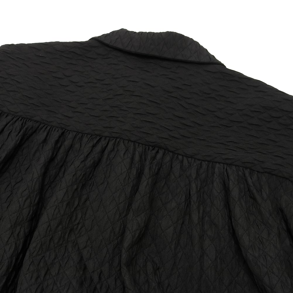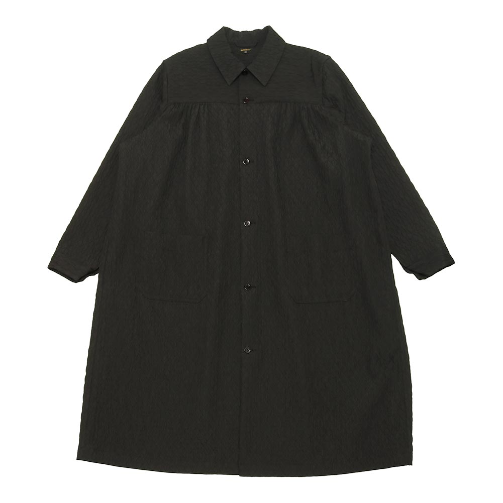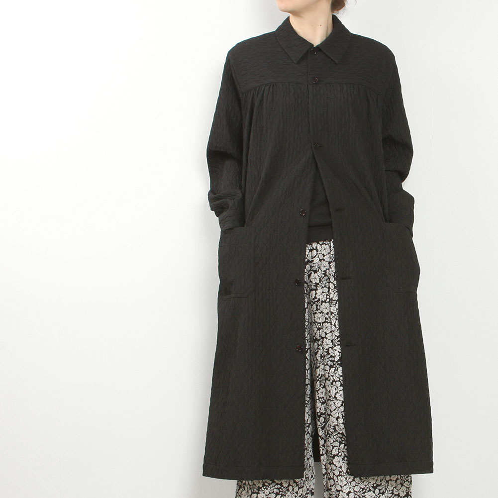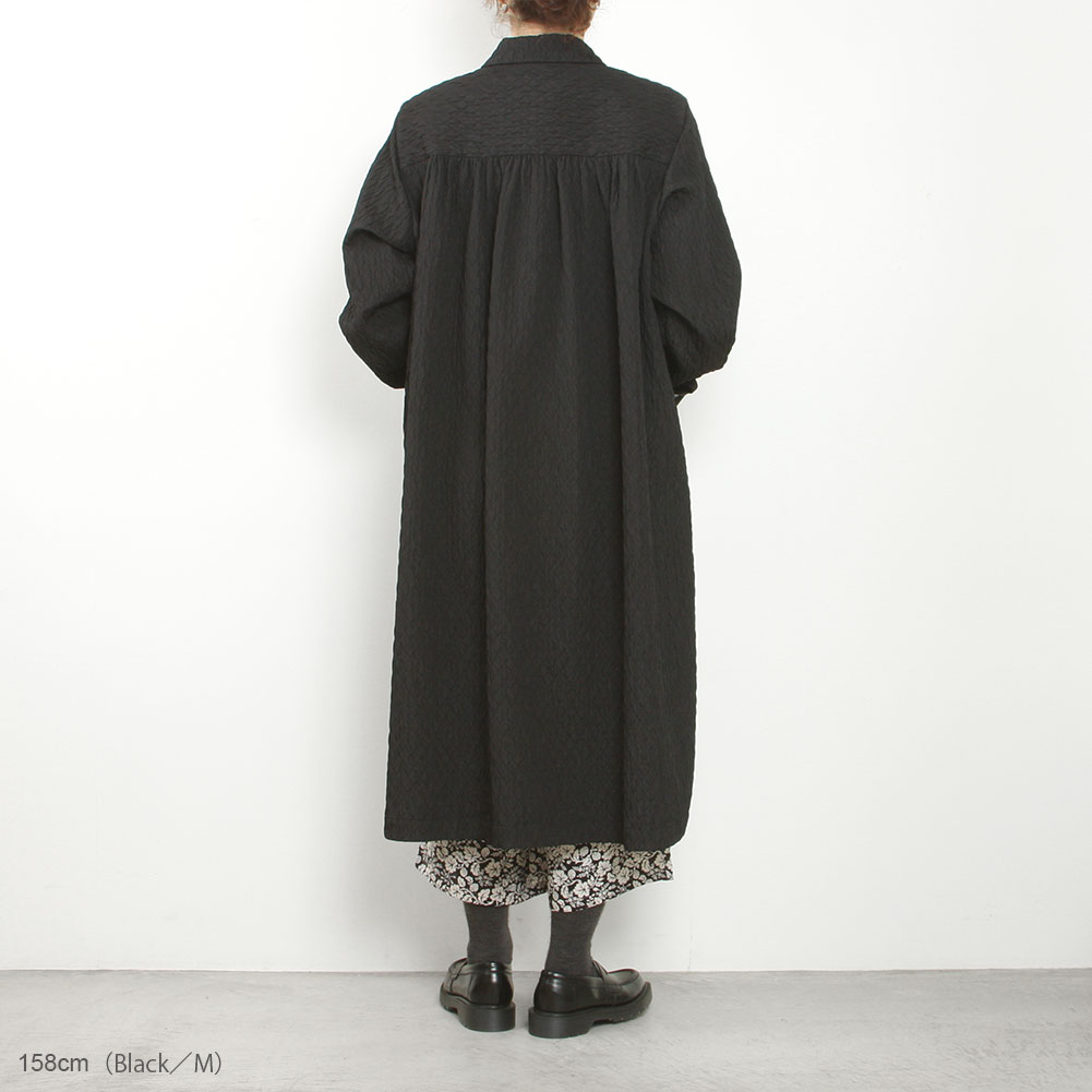 表情豊かなキルティング生地を使用したコート。ほんのりと光沢感があり、上品な印象に仕上がっています。コートとしてはもちろんですが、ボタンを留めてワンピース風に着ていただくのもおすすめです。どちらかと言うと薄手寄りの生地なのでシーズン長くお使いいただけます。