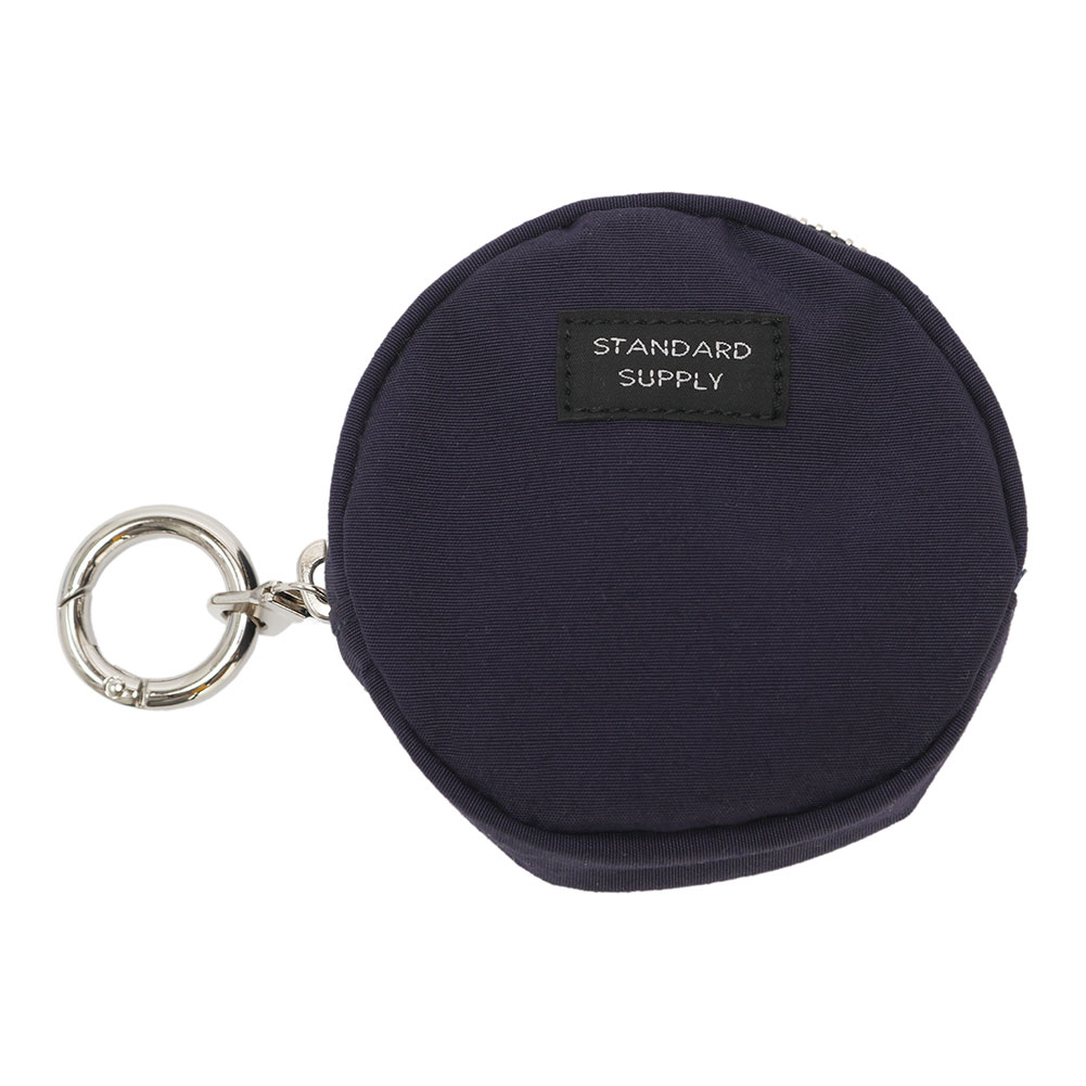 ラウンド型マチ付きポーチ。イヤフォンや鍵などの小物収納にぴったり。丸型カラビナ付きで、ストラップやリングに掛けて使えます。
