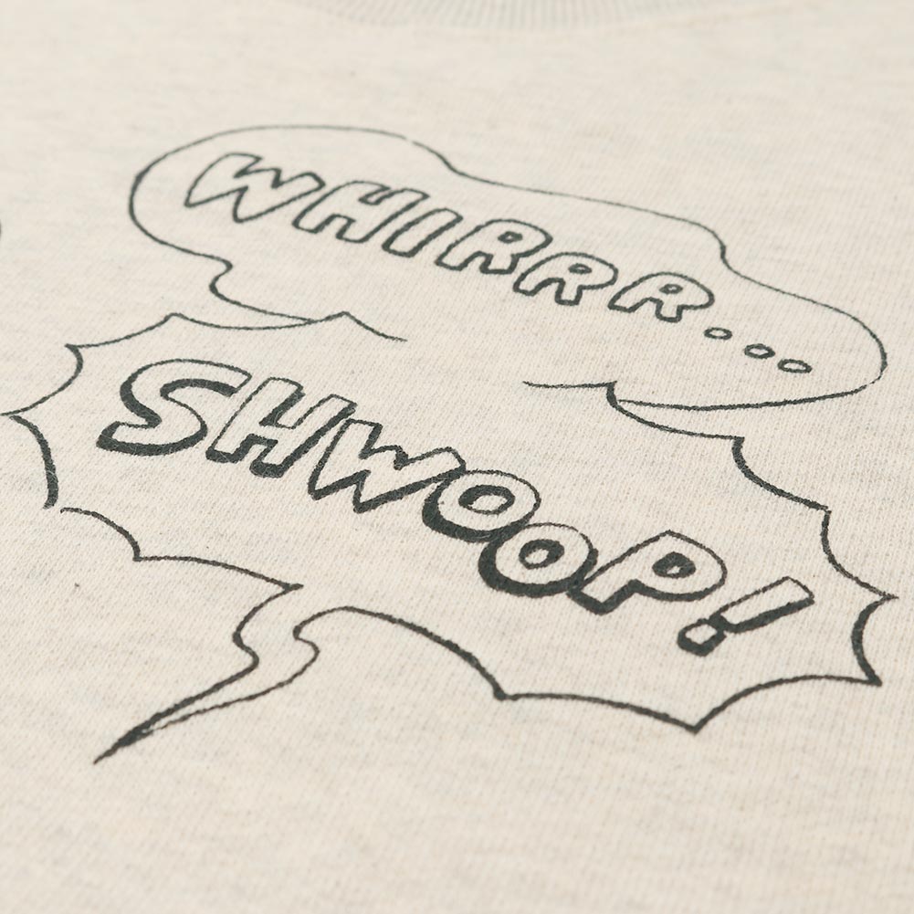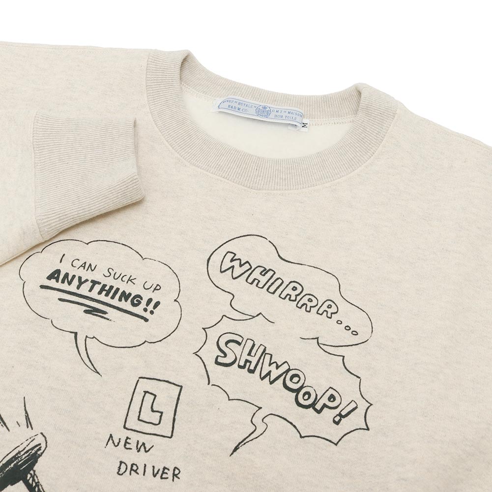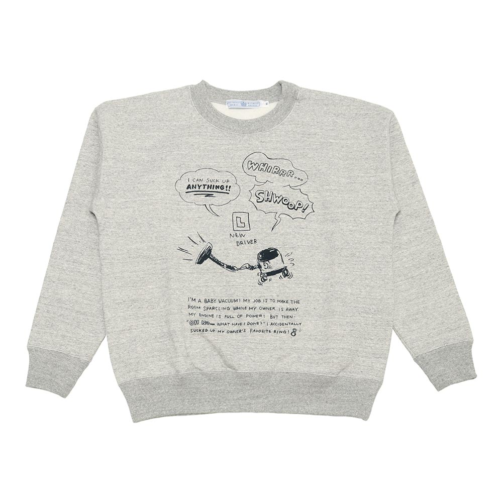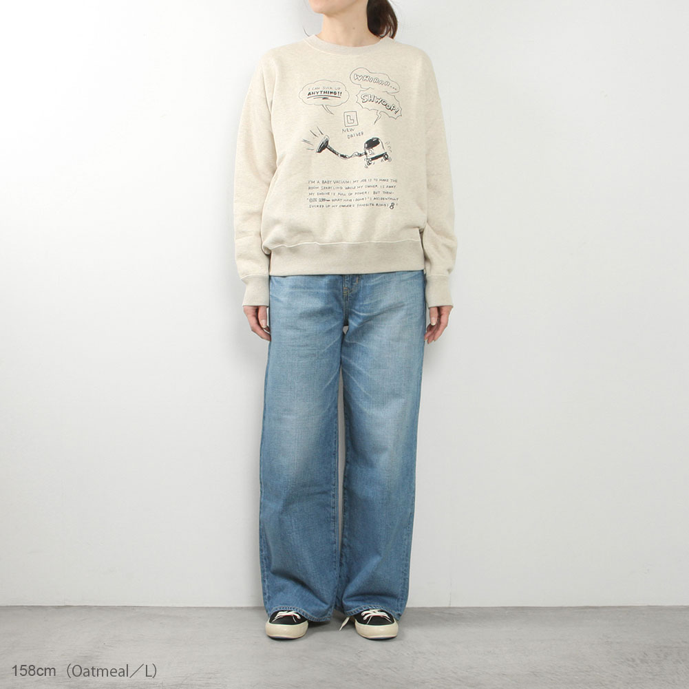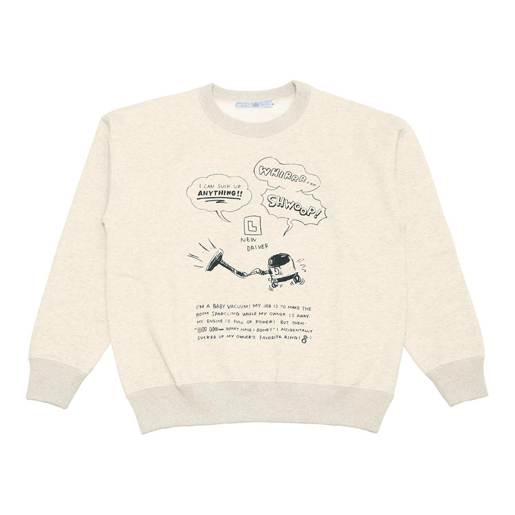 プリント柄のスウェットはコンパクトなサイズながら着用するとゆったりとした着心地。 柔らかくて着心地も抜群です。 アクセントになっている"VACUUM BOY"は目を引くプリントになっています。VACUUM BOYがうっかり主人のお気に入りの指輪を吸い込んでしまったというストーリーのR&Dらしいプリント柄になっています。着丈は長すぎずスッキリとしていて、ボリュームのあるスカートやパンツにも相性が良さそうです。裏毛で長い期間活躍する優秀な一着になっています。