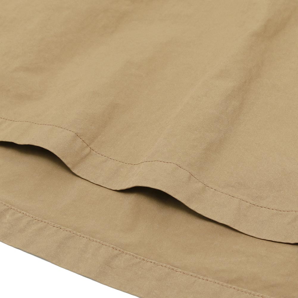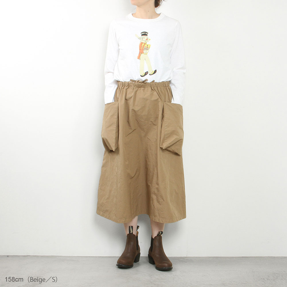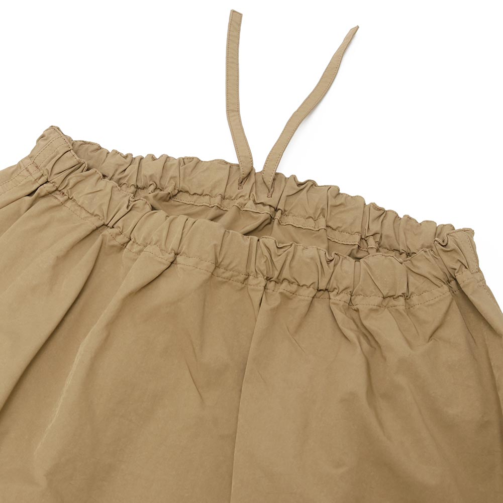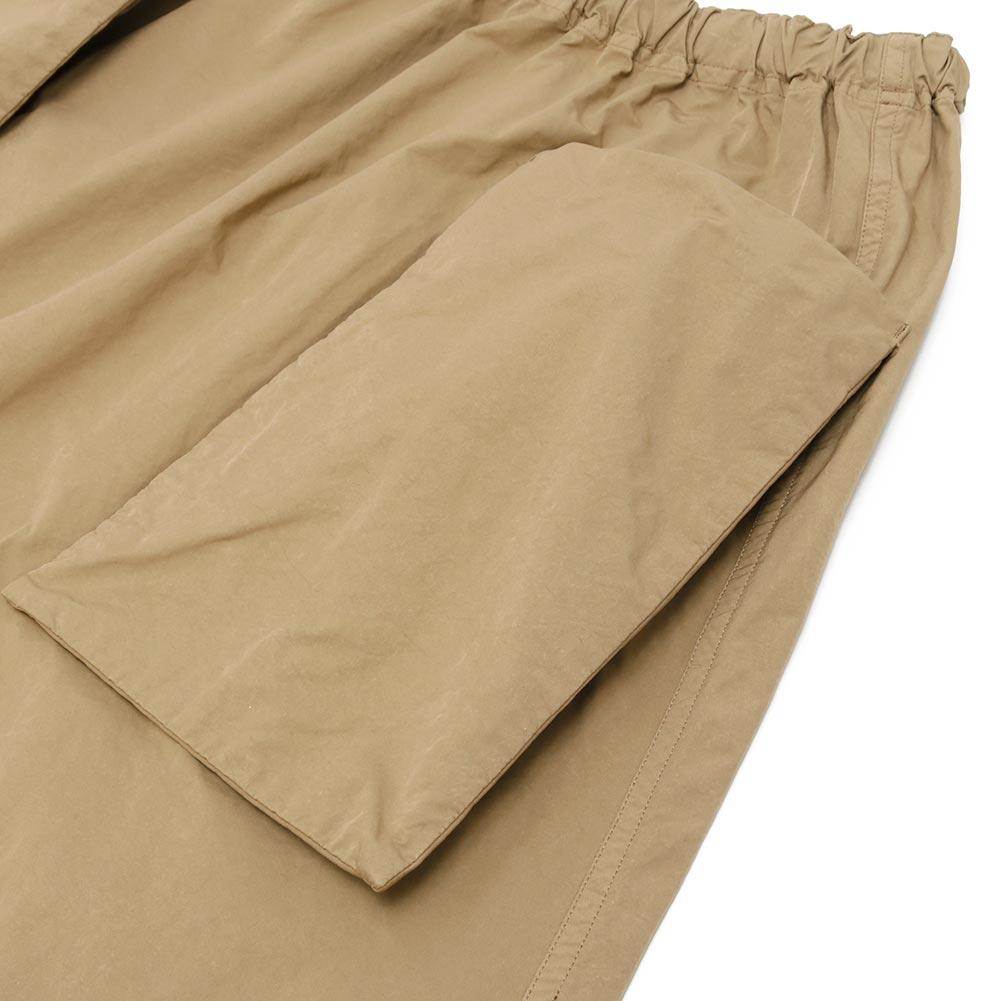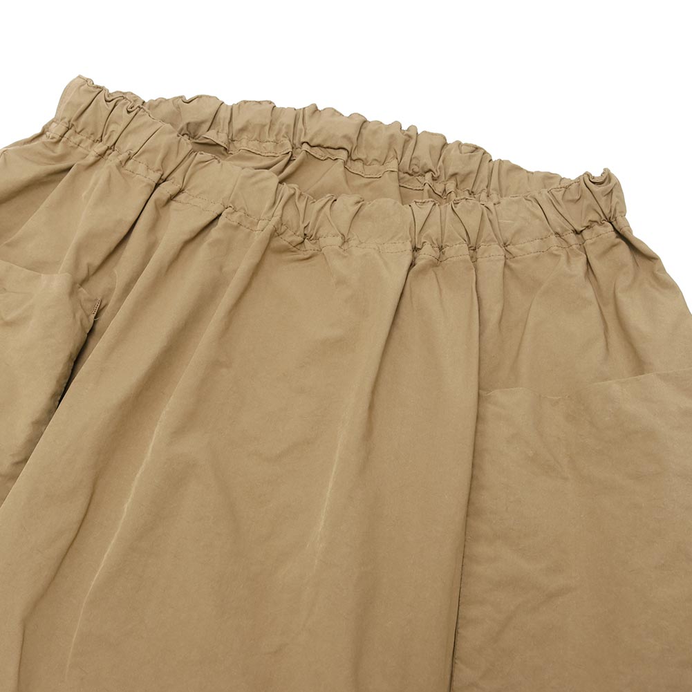キメの細かいpolyester/ nylonで仕上げられた生地は程よいハリ感があり、とても軽くサラッとした肌触りです。ツヤがありながらも嫌味のない光沢感で上品な仕上がりです。大きくて立体的なポケットがポイントになっています。 シーズン長く愛用できます。 シンプルながらも存在感のある一品。 ウエストはゴム仕様で楽に履くことができ、内側の紐で調節が可能です。