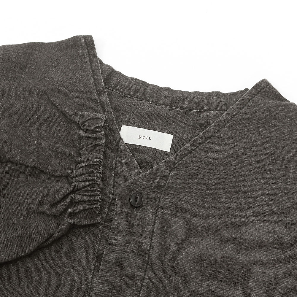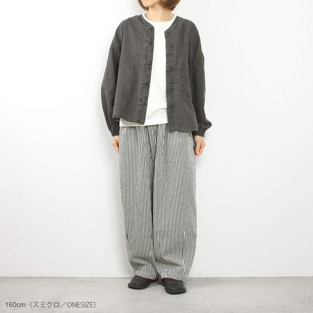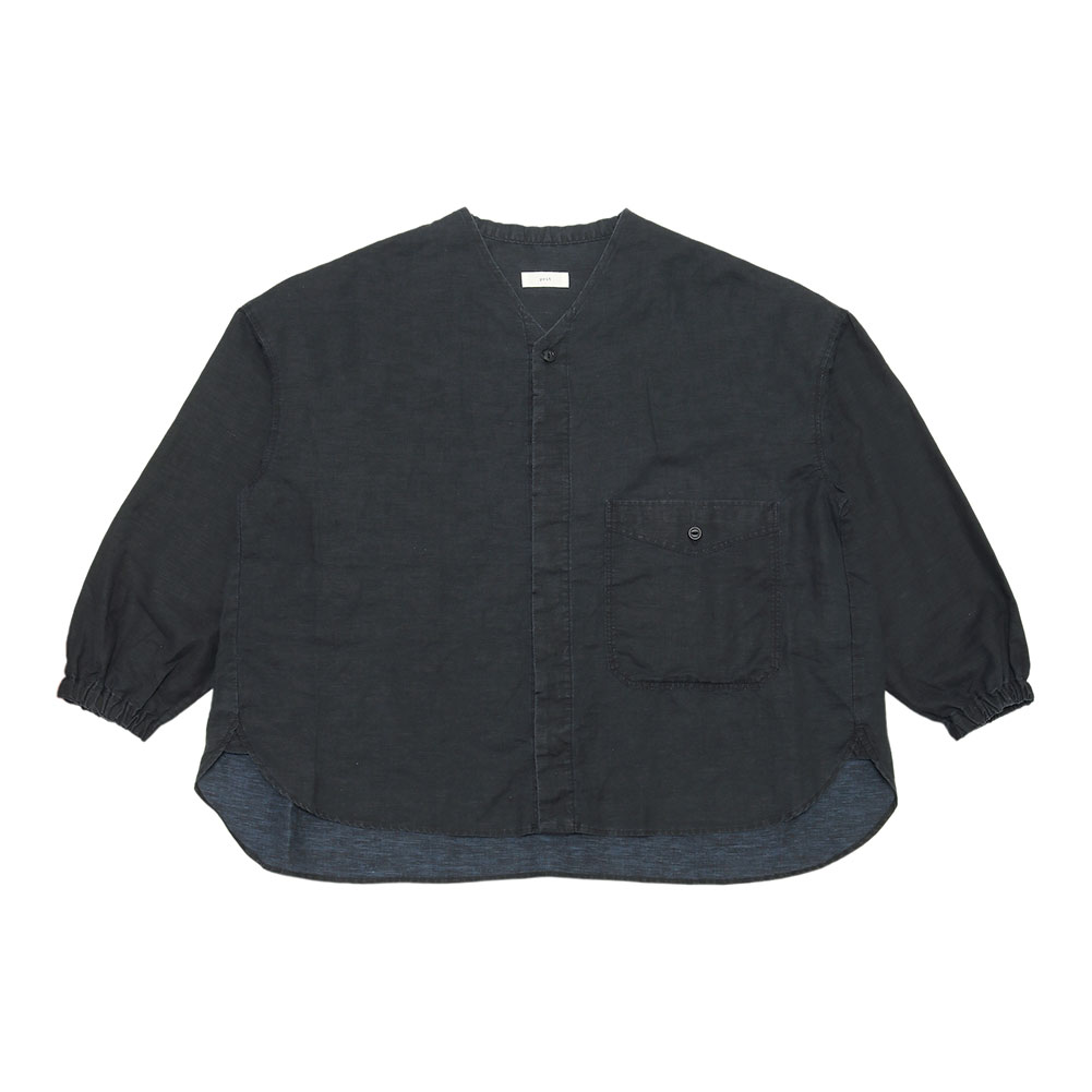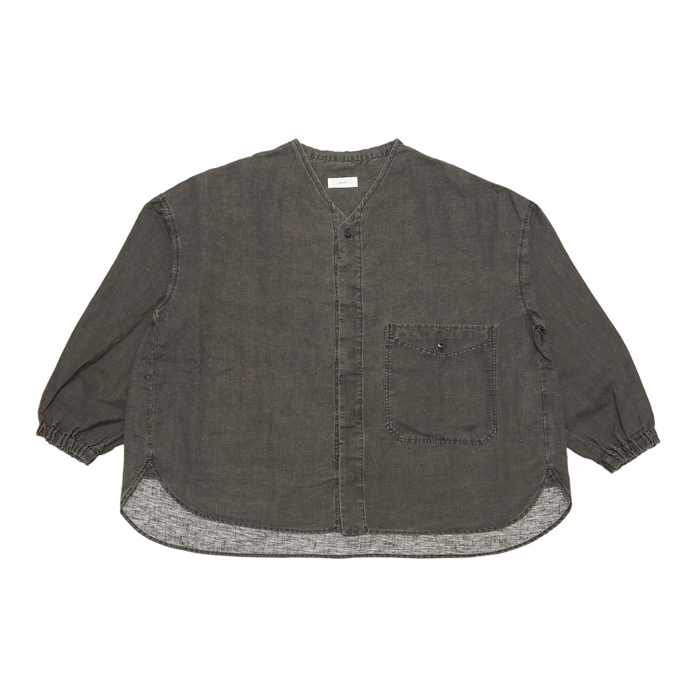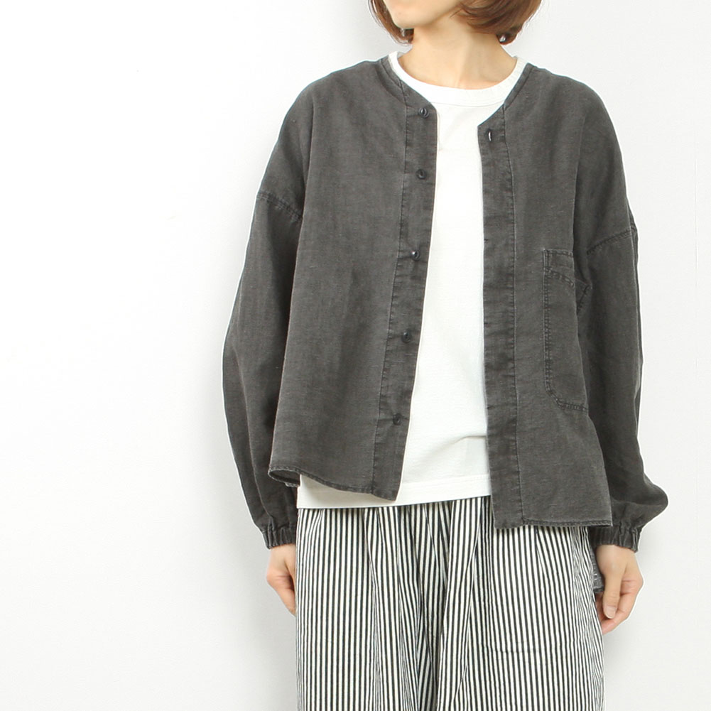 薄手で丈夫なコットンリネン素材で、これからの夏には軽くてとても涼しい生地です。ノーカラーなので前を開けて羽織でも使いやすく、前後差のある着丈で小柄な方でもバランスよく羽織れます。袖口にはゴムが入っているので肘の辺りまで上げることも可能です。