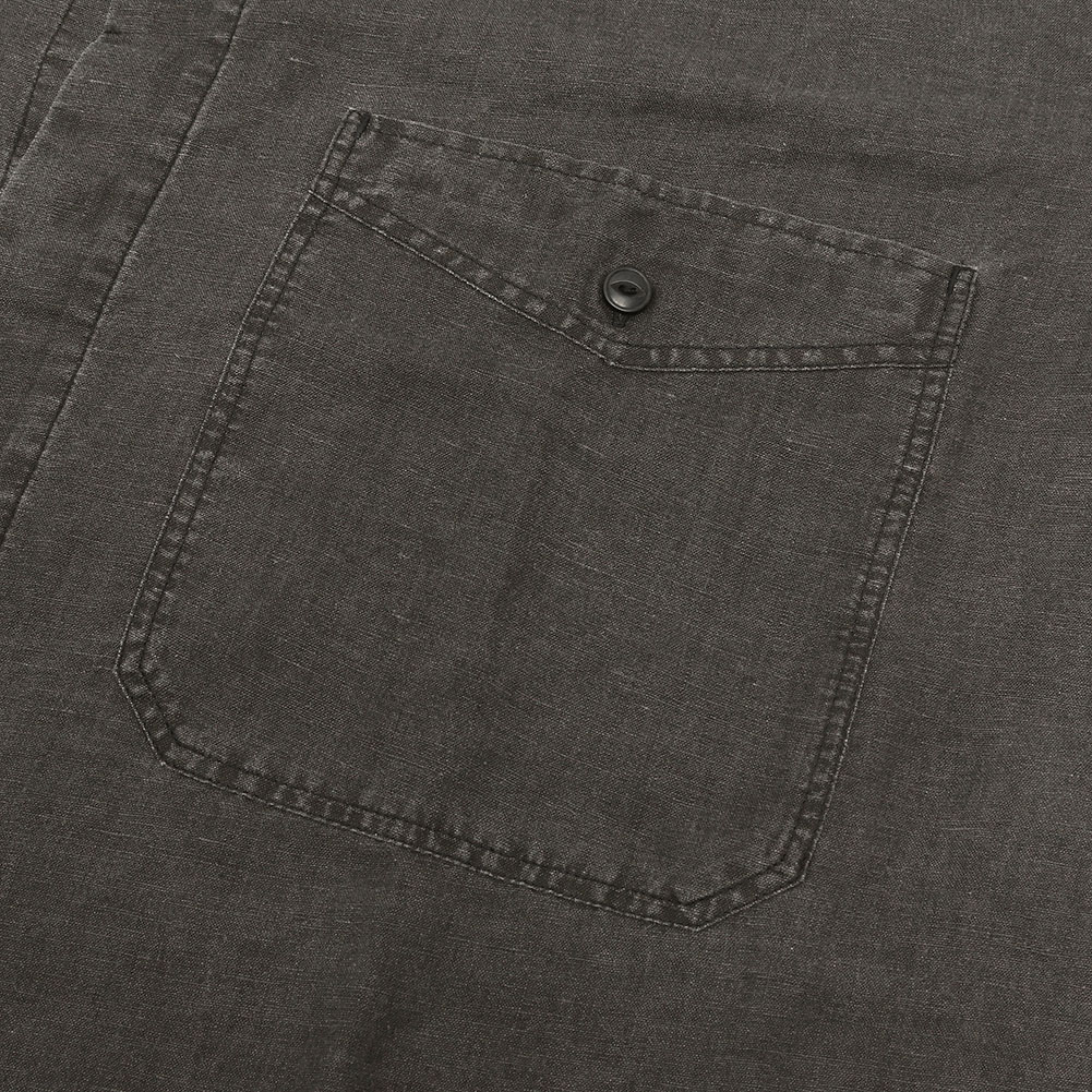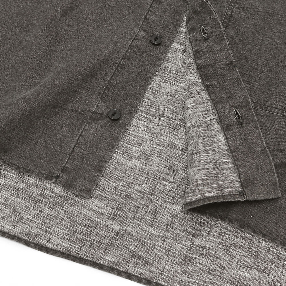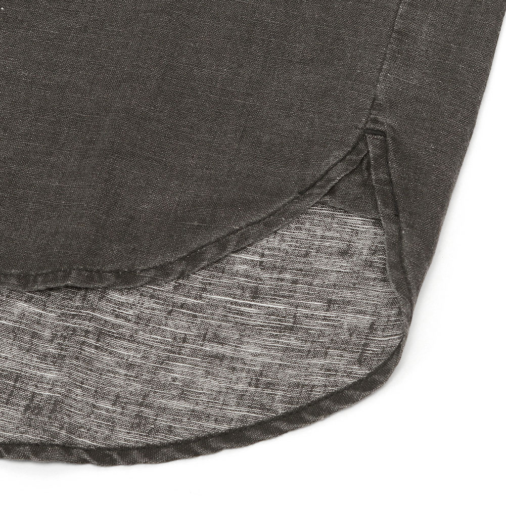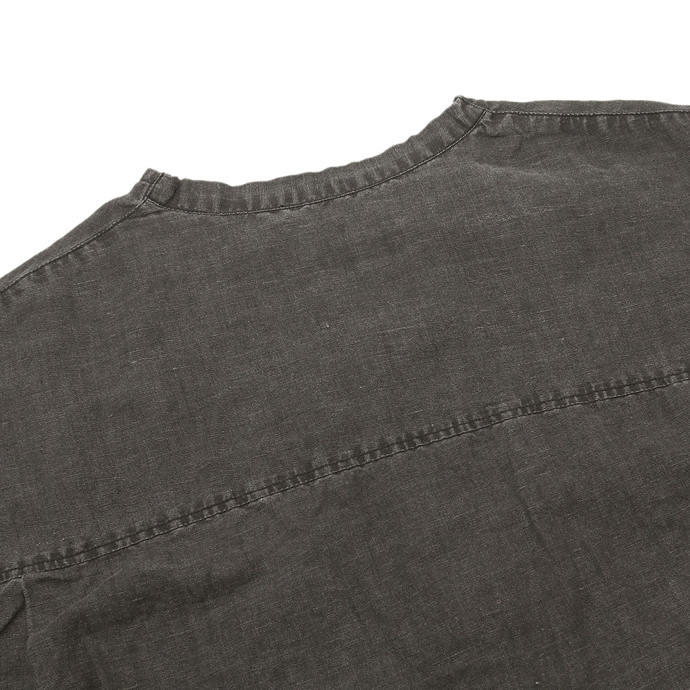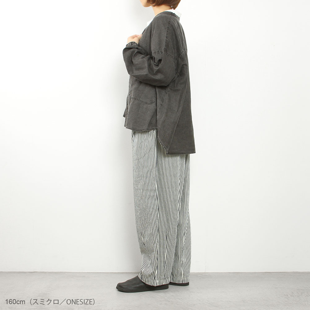 薄手で丈夫なコットンリネン素材で、これからの夏には軽くてとても涼しい生地です。ノーカラーなので前を開けて羽織でも使いやすく、前後差のある着丈で小柄な方でもバランスよく羽織れます。袖口にはゴムが入っているので肘の辺りまで上げることも可能です。