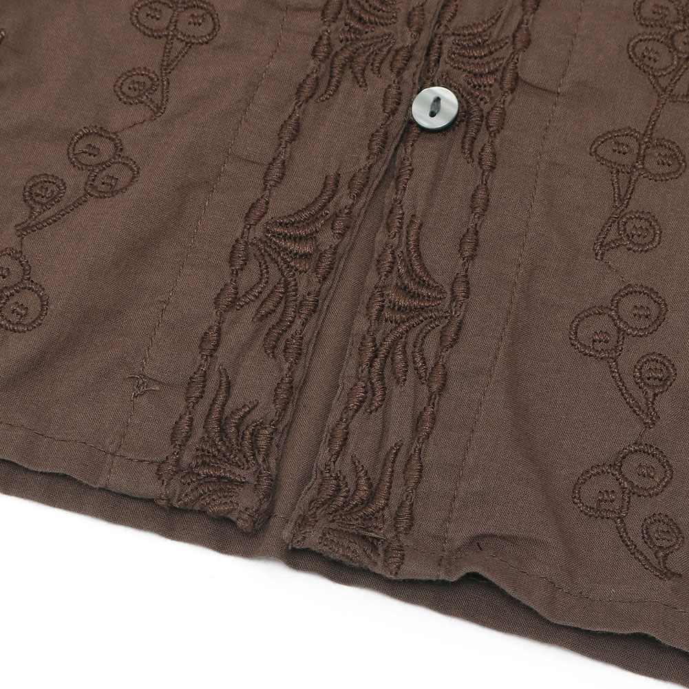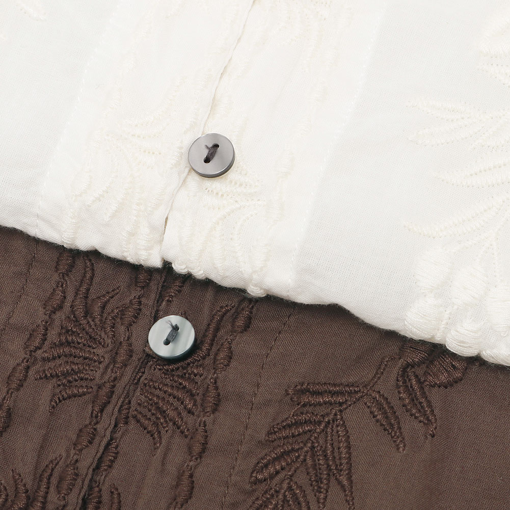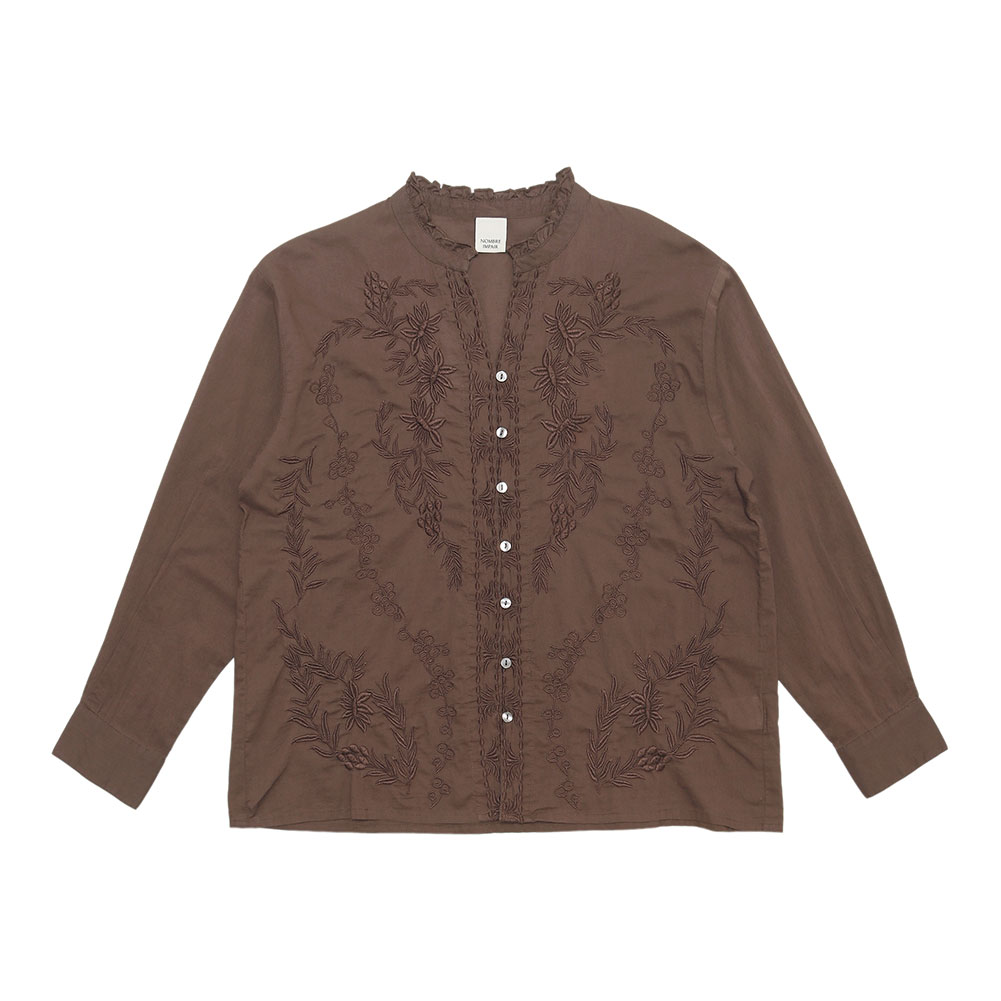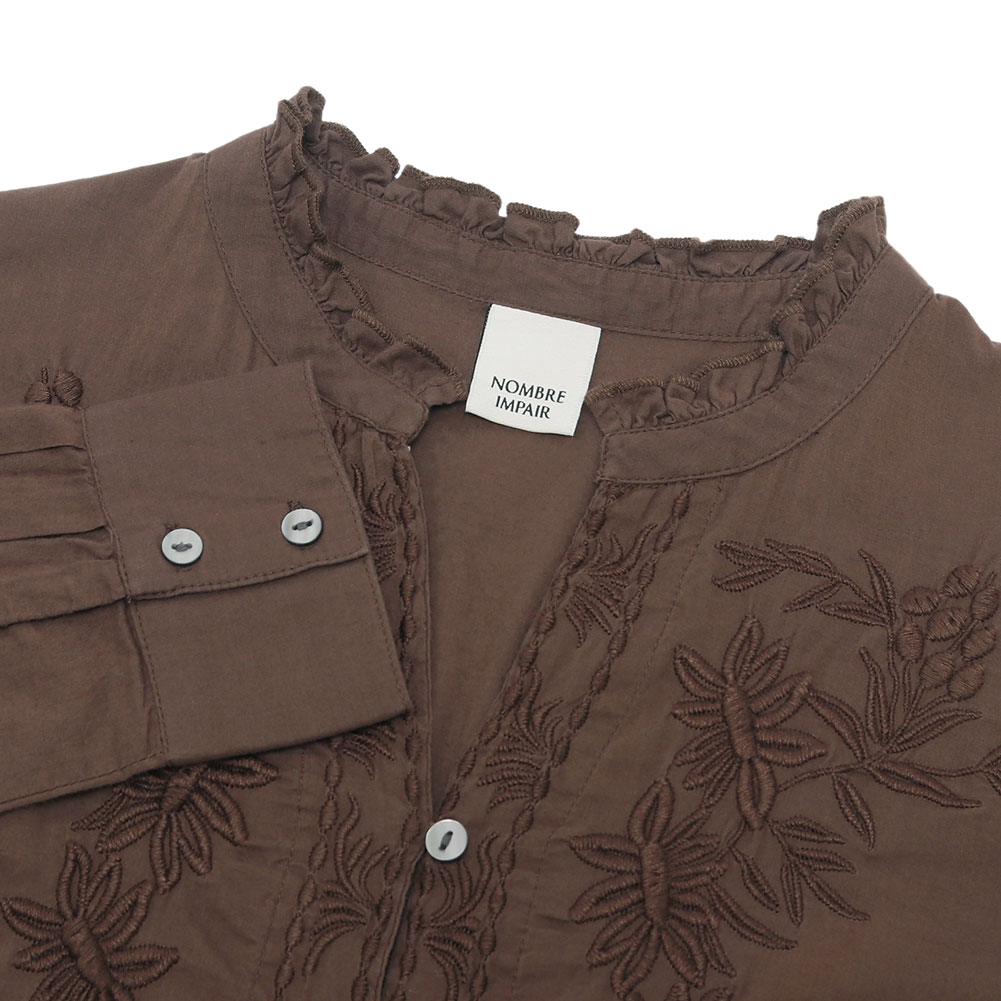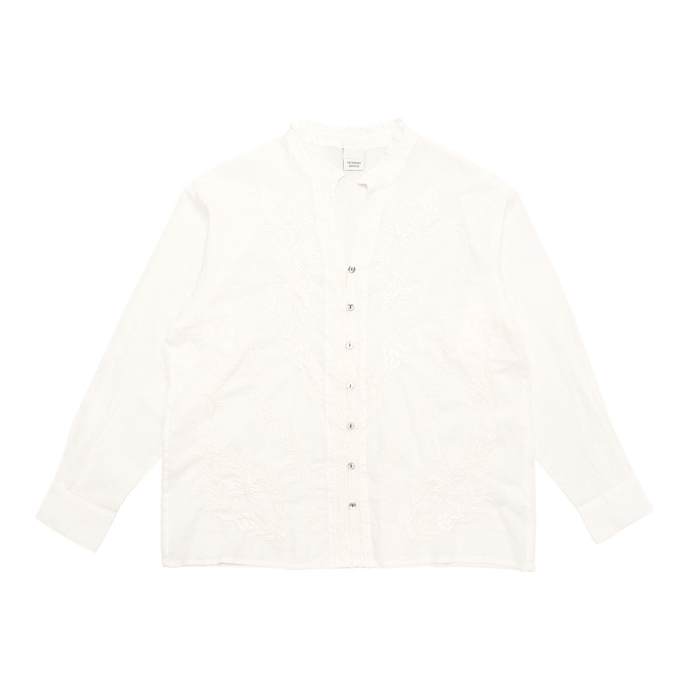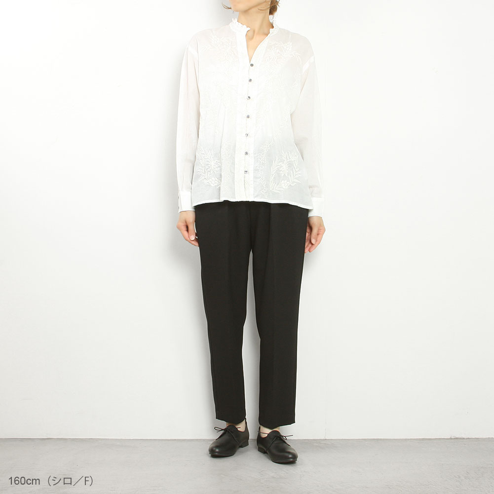 前身頃にたっぷりと施された立体感のあるボタニカル刺繍が目を惹くブラウス。柔らかなインド綿ローン素材で、さらっとした肌ざわりが魅力です。