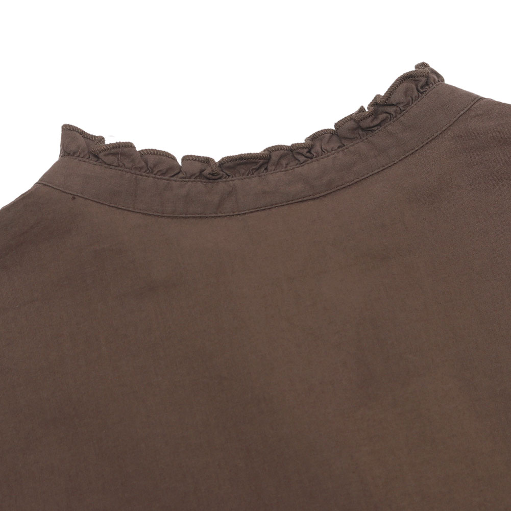 程よく開いたスキッパーネックに、小さなフリル襟が可愛らしいアクセント。寒い時期にはニットやジャケットを合わせてコーディネートしたいですね。