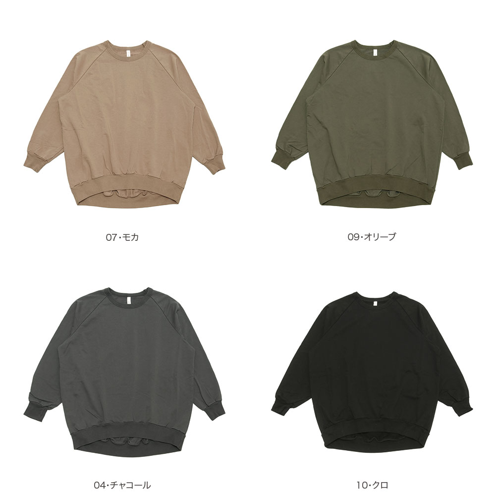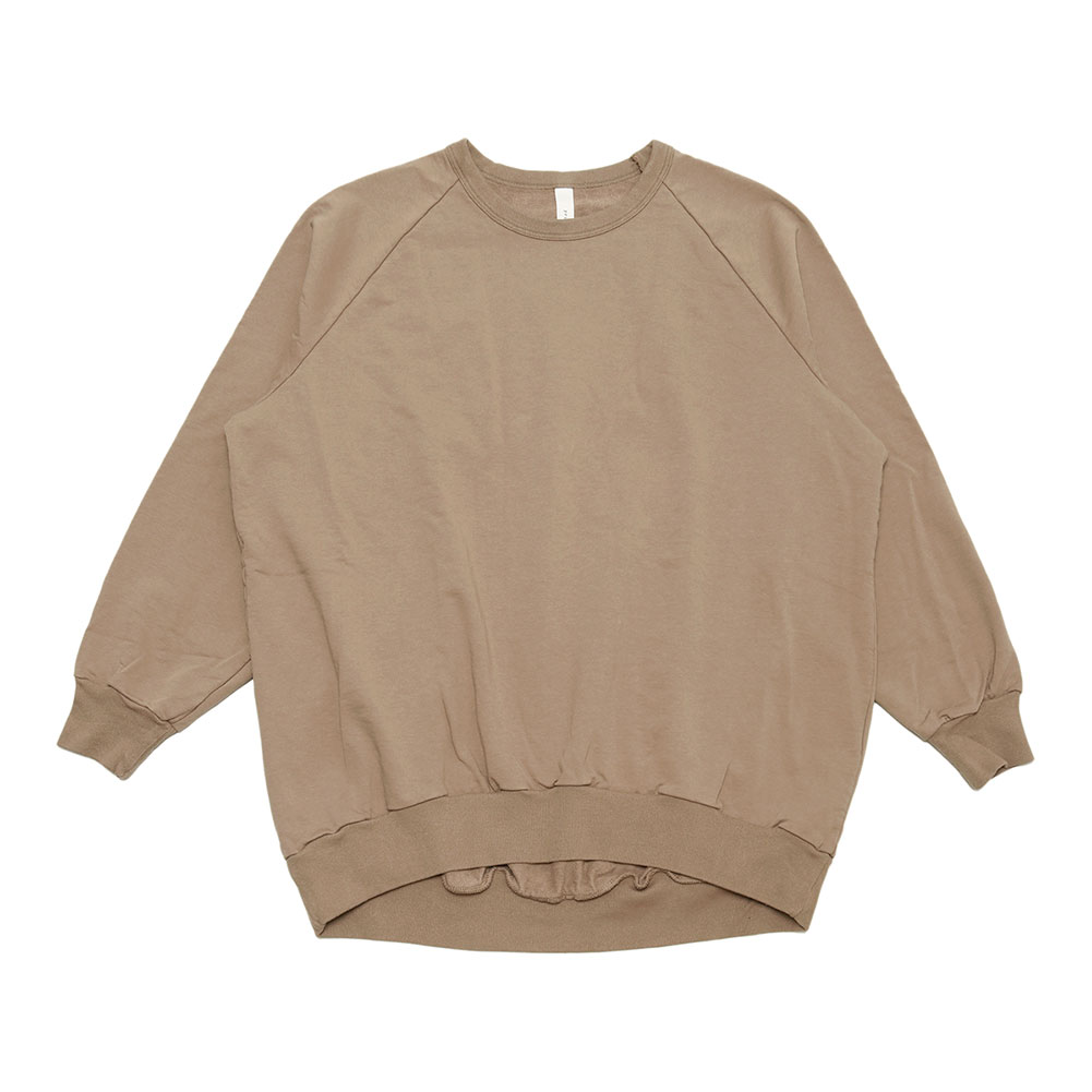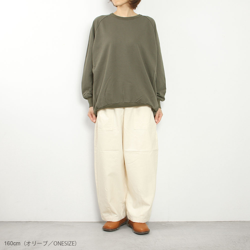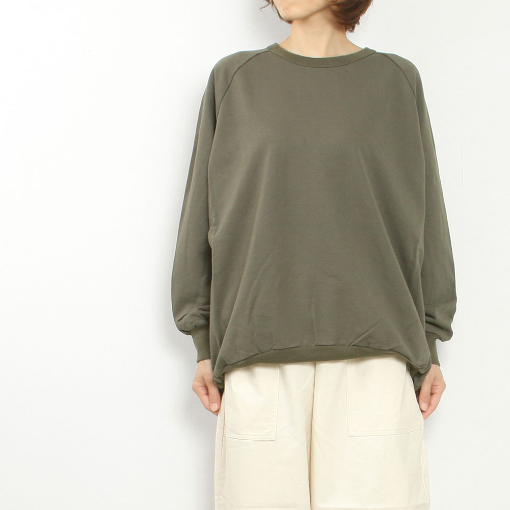 前後差のあるデザインと、少し長めの着丈ですが、リブになっているので折り返すとフワッと着られて可愛いです。肩馴染みのよいラグランスリーブ仕様で着る人に馴染みます。