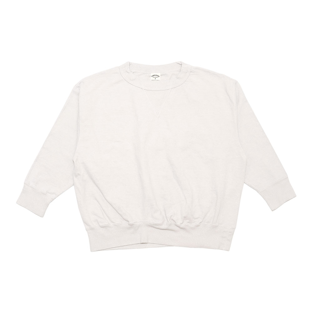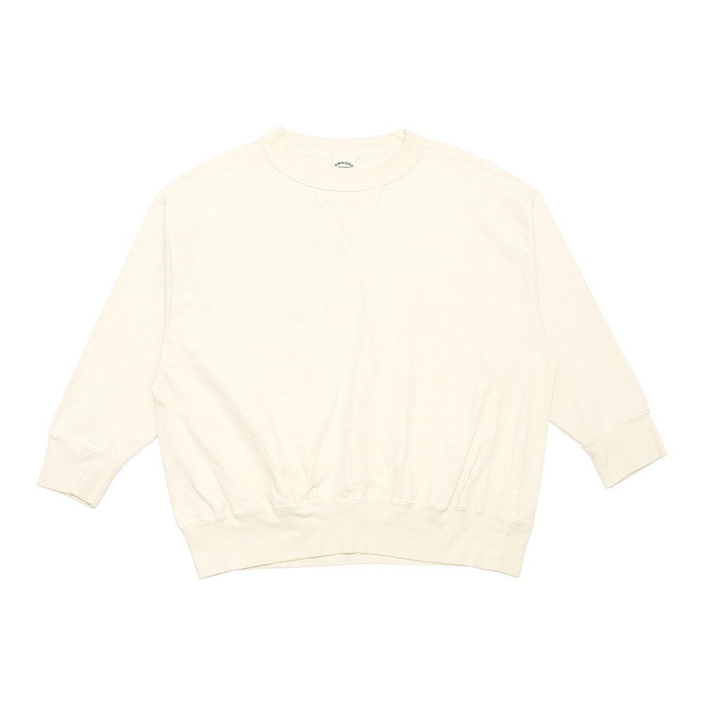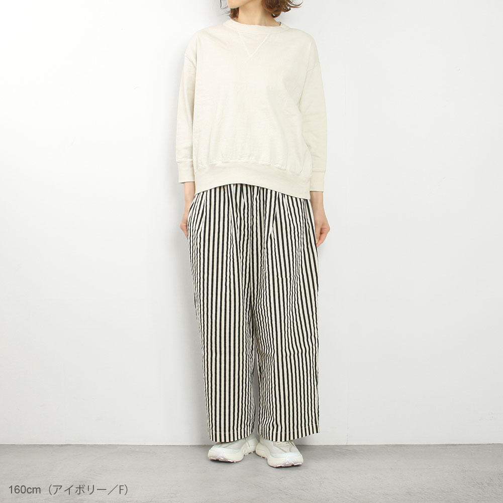 首元はほどよくゆとりのあるクルーネックに、肩幅と身幅にゆとりを持たせ、脇下から裾にかけて広がりながら落ちていきます。筒状の編み機を使用しているので、サイドシームがなく丸みのあるワイドシルエットが独特のスタイルを演出しています。