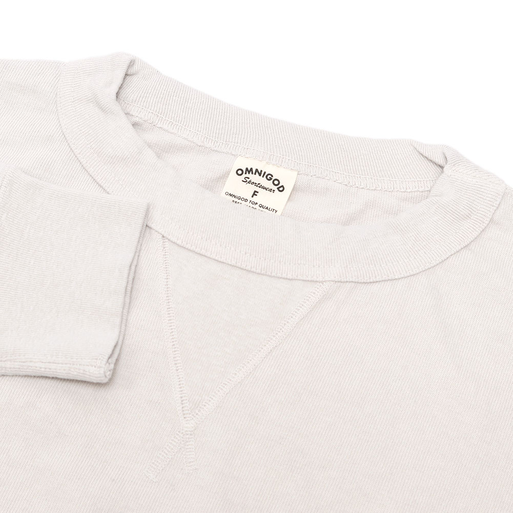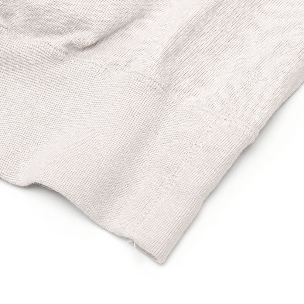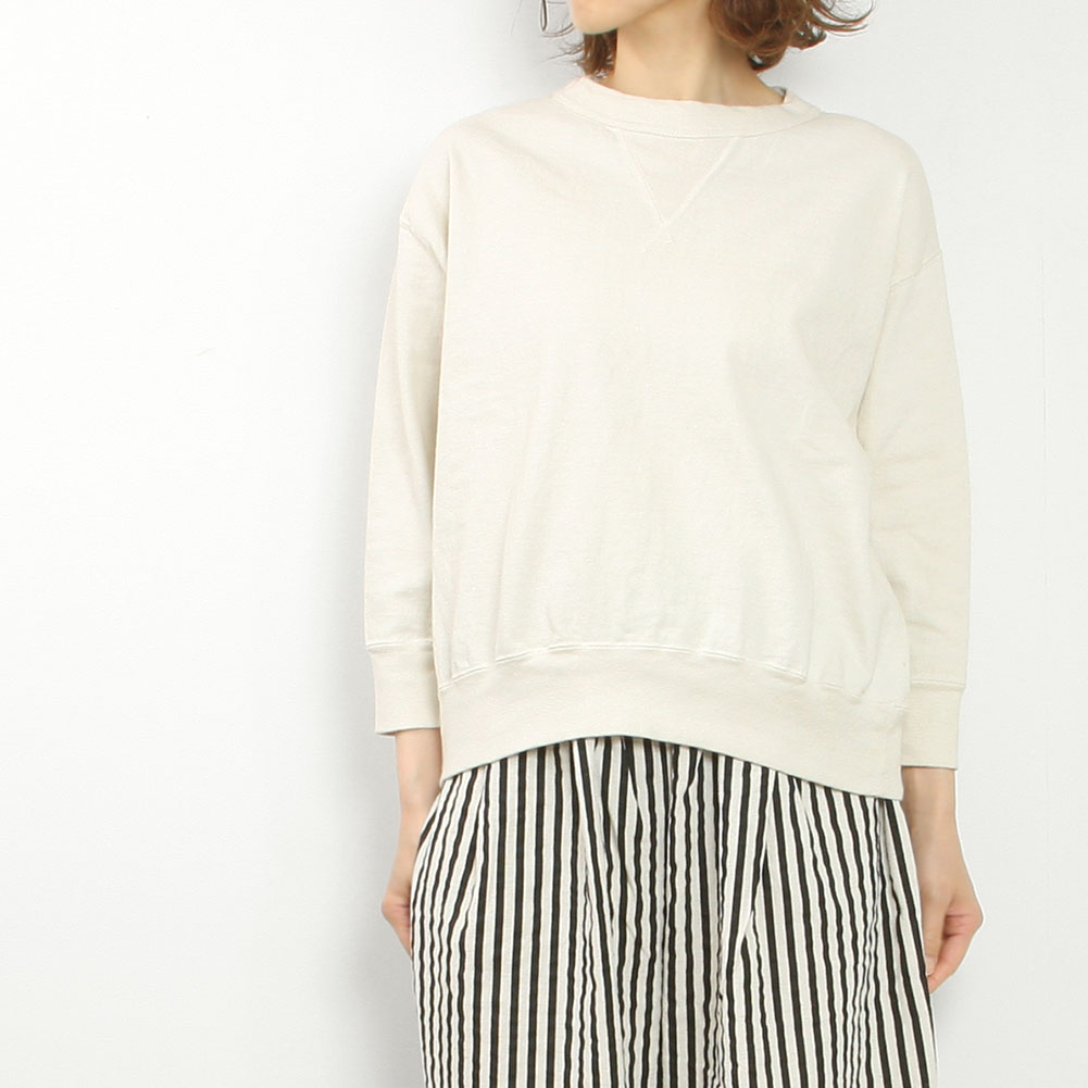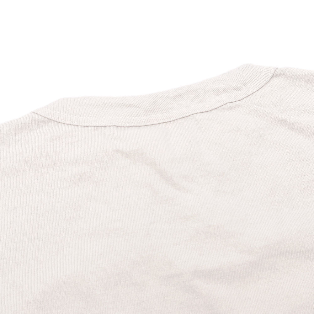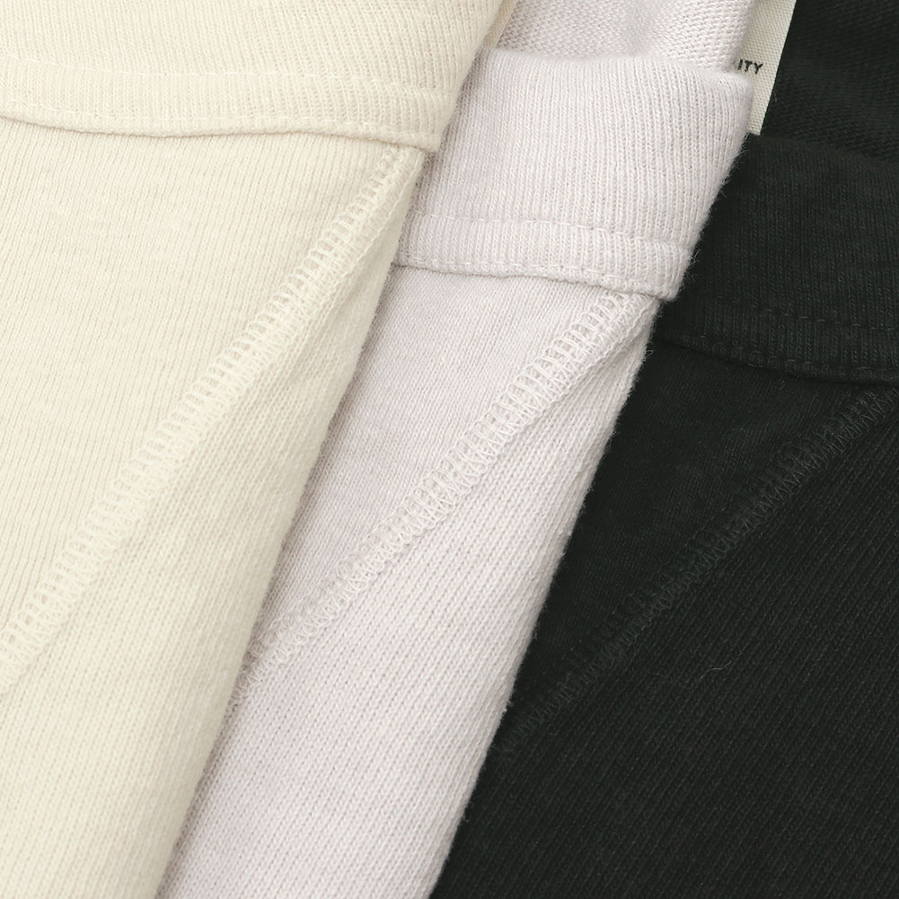 引き揃えた糸を丁寧に編み込むことで実現できる、目がしっかりと詰まったコットン天竺素材を使用。カットソーほど薄くなく、スウェットほど厚みがなくといったシーズンレスで扱える素材です。洗濯機で繰り返し洗っても大丈夫なタフさが魅力。肌触りが良いのはもちろんですが、着込むほどに体に馴染み、経年変化も一緒に楽しめるところも長く愛される理由です。