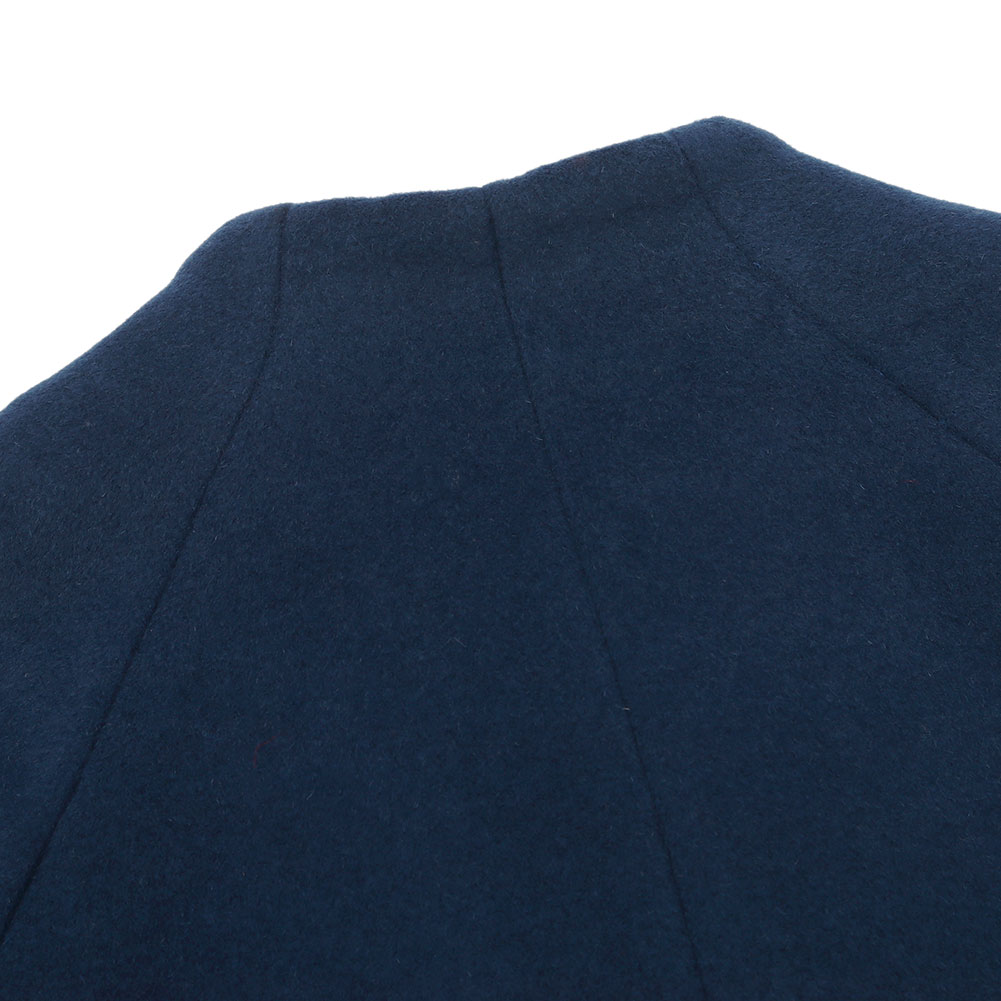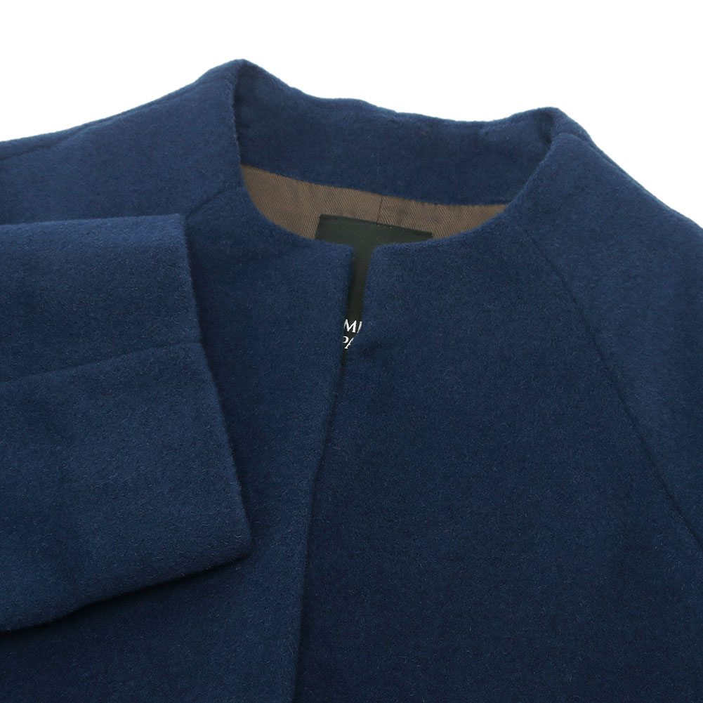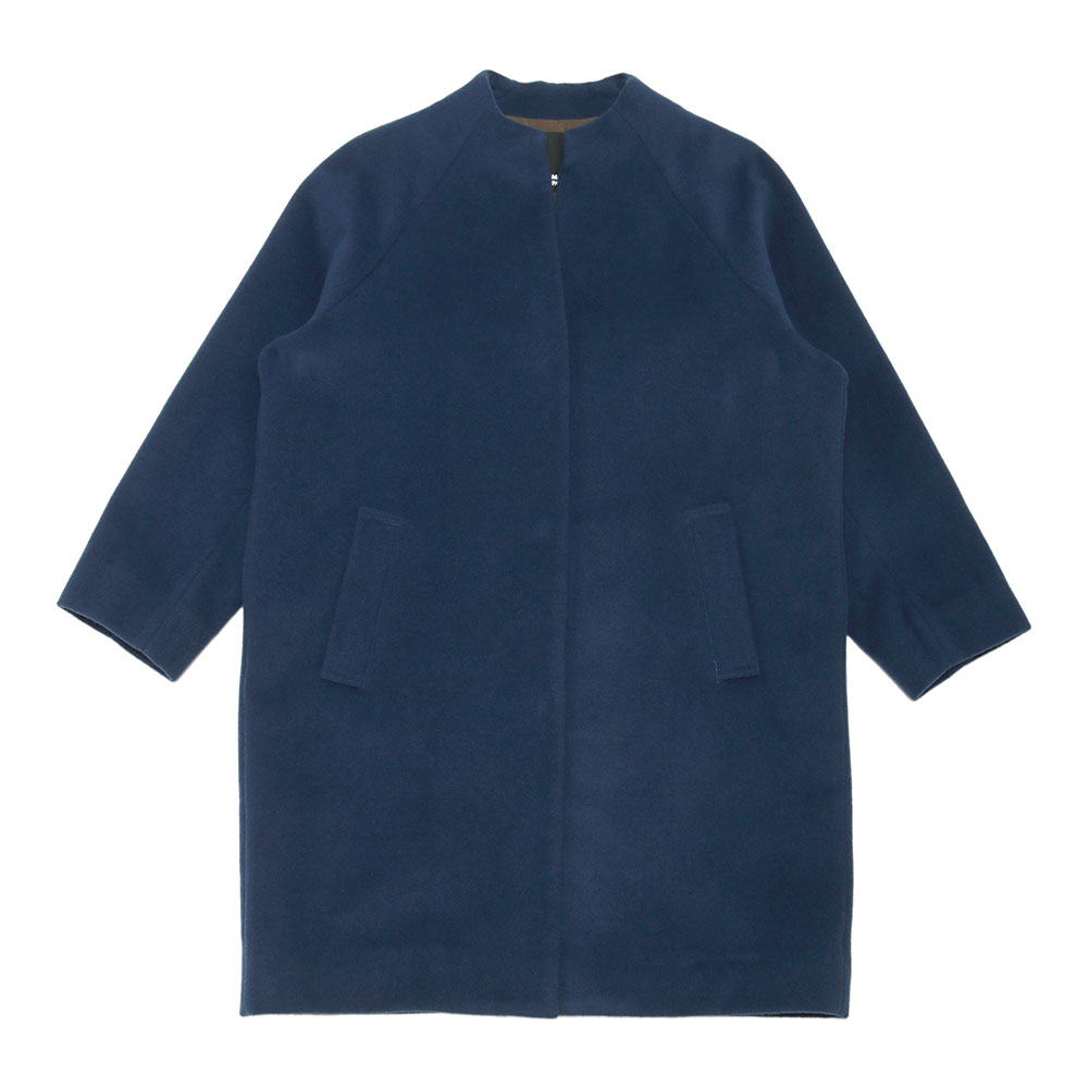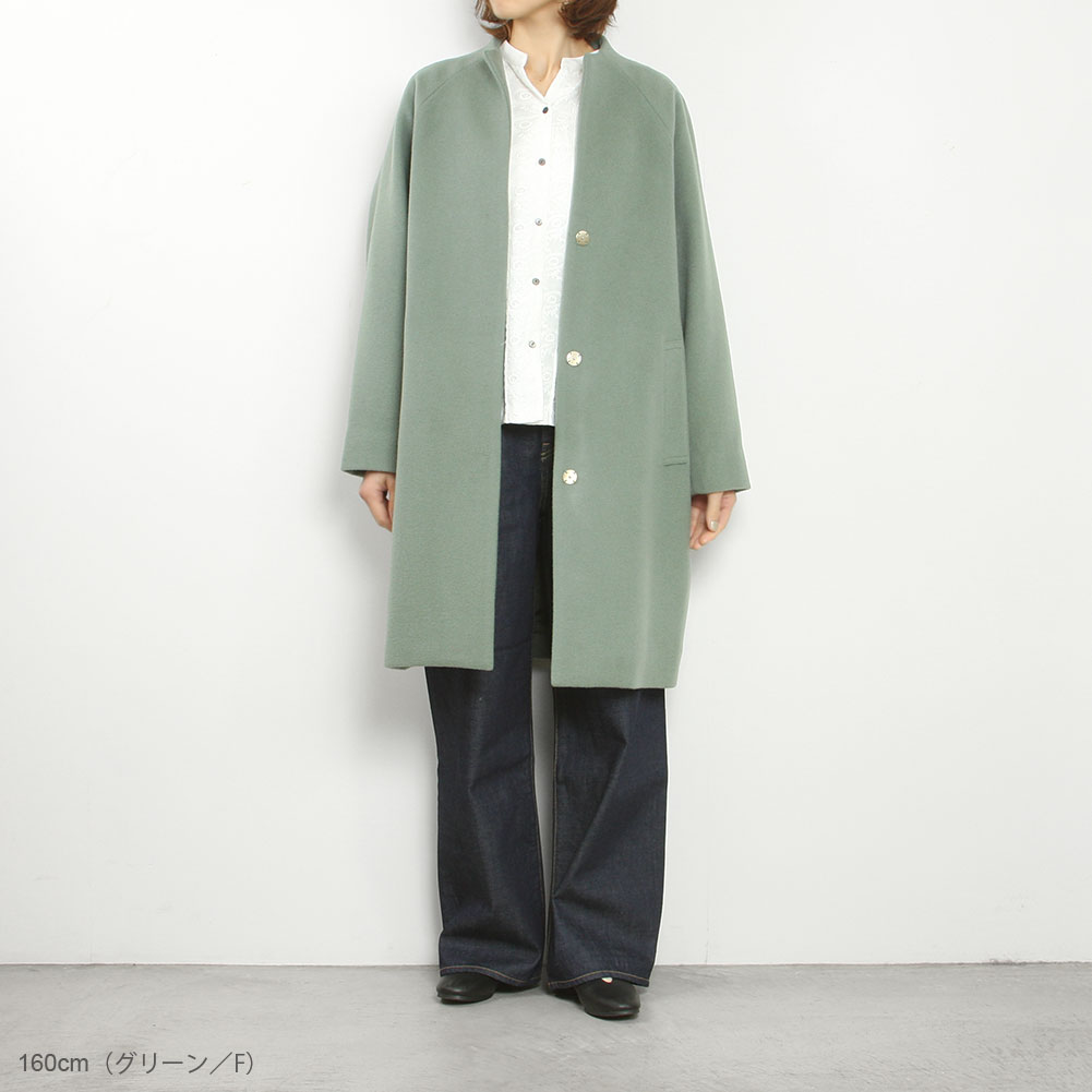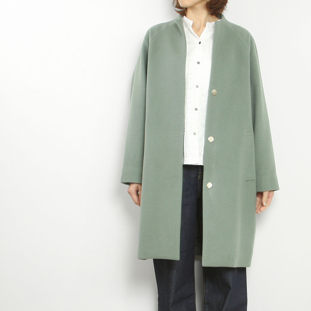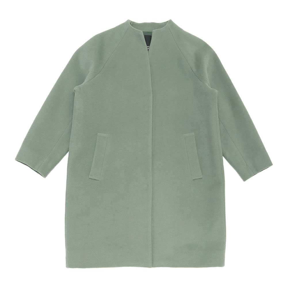 広がらないすっきりとしたシルエットとバランスのよい着丈も魅力、インナーとも合わせやすいボトルネックの首元もポイントになっています。