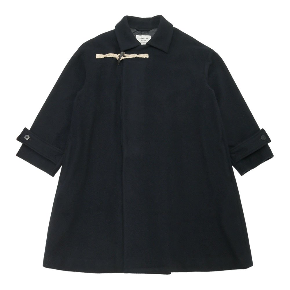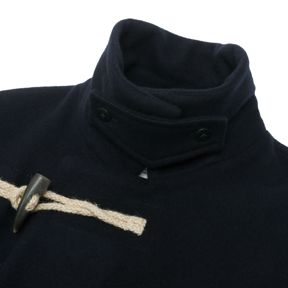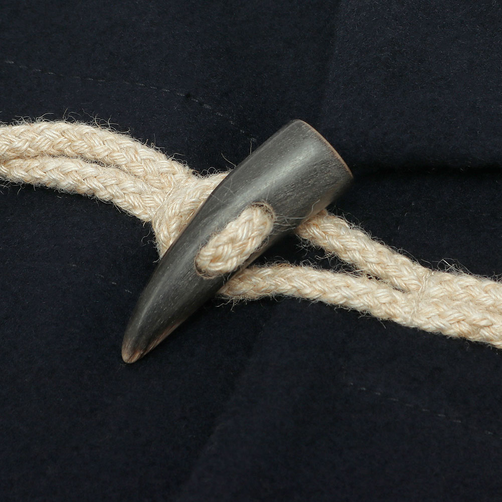 水牛のトグルとジュートコードがアクセントになったデザインで、衿にチンストラップを付けてスタンドカラーとして着ることもできる2way仕様。