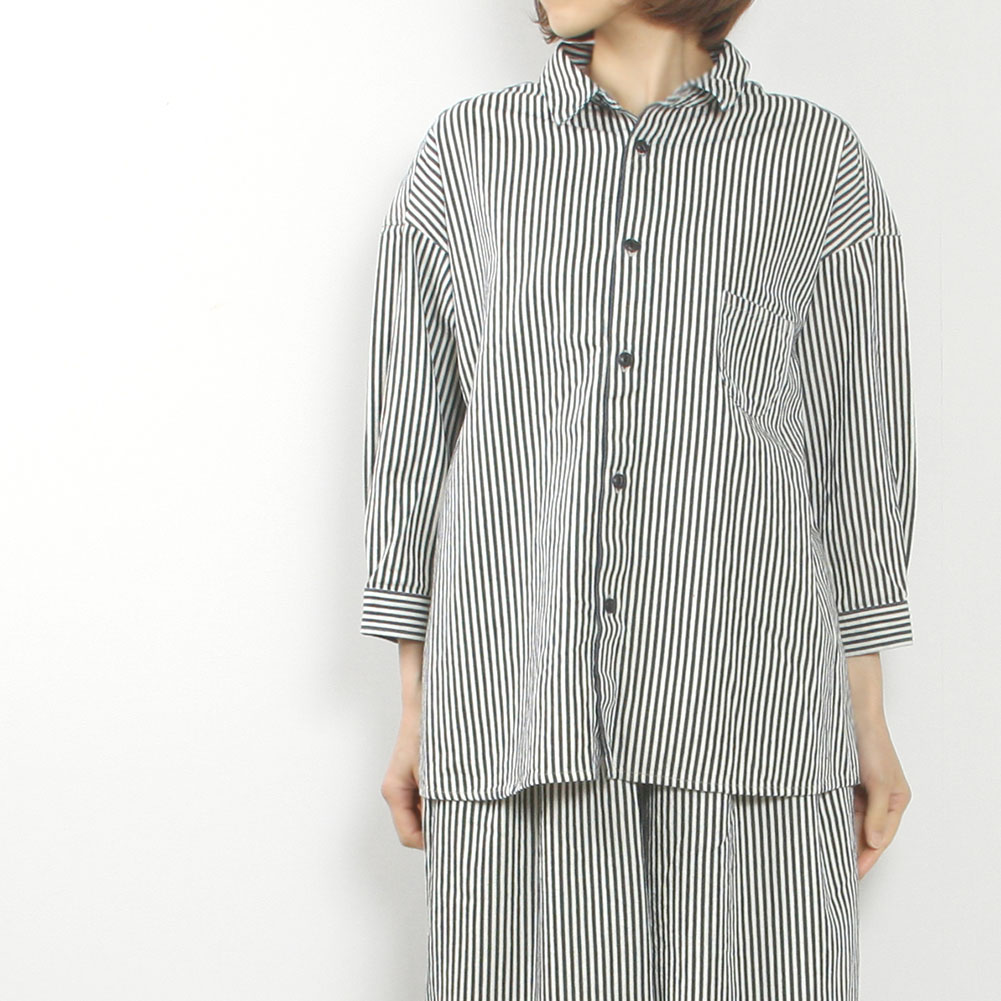 ドロップショルダーでゆとりのあるシルエット。さらりと1枚でもボタンをあけて羽織りとしてもお使いいただけます。胸に付いた小さなポケットや小さめの衿も可愛らしいポイントです。