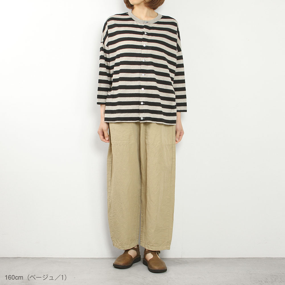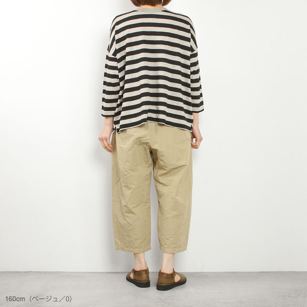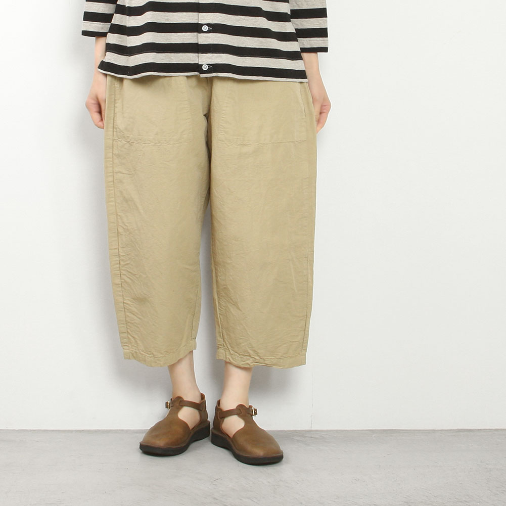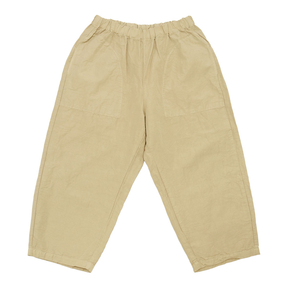 コットンリネンの軽くて柔らかい素材のコクーンパンツです。サイズ展開は0と1で、丈の長さが大きく違うのでお好みに合わせて選べます。さらりとした肌触りで夏にとても涼しく穿けます。