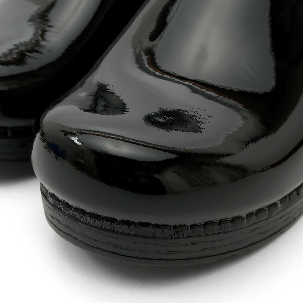 使用しているのはパテントレザー(エナメル)。光沢のある仕上がりは存在感があり、ワンピースやきちんと感のある着こなしにも馴染みます。